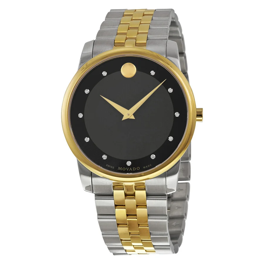Stainless steel case with a two-tone (silver and yellow gold PVD) stainless steel bracelet. Fixed yellow gold PVD bezel. Black museum dial with yellow gold-tone hands and diamond hour markers. The Movado dot appears at the 12 o'clock position. Dial Type: Analog. Quartz movement. Scratch resistant sapphire crystal. Pull / push crown. Solid case back. Round case shape. Case size: 40 mm. Case thickness: 10.25 mm. Band width: 21 mm. Band length: 9 inches. Deployment clasp. Water resistant at 30 meters / 100 feet. Functions: hour, minute. Casual watch style. Watch label: Swiss Made. Movado Museum Black Dial Two-tone Men's Watch 0606879. GENERAL Box Type: Original Box CASE Case Thickness: 10.25 mm Case Material: Stainless Steel Case Shape: Round Case Back: Solid BAND Band Material: Stainless Steel Band Type: Bracelet Band Color: Two-tone (Silver-tone and Yellow Gold PVD) Band Length: 9 inches Band Width: 21 mm Clasp: Deployment DIAL Dial Color: Black Museum Type: Analog Crystal: Scratch Resistant Sapphire Hands: Yellow Gold-tone Dauphine-style shape Dial Markers: Diamond Second Markers: The Movado Dot appears at the 12 o'clock position Bezel: Fixed Bezel Color: Yellow Gold PVD Bezel Material: Stainless Steel Crown: Pull / Push INFORMATION Brand: Movado Series: Classic Fusion Collection Name: Classic Gender: Mens Model: 0606879 Watch Label: Swiss Made Movement: Quartz FEATURES Water Resistance: 30 meters / 100 feet Functions: Hour, Minute Watch Features: Analog, Gold, Stainless Steel, Diamond ADDITIONAL INFO Watch Style: Casual Warranty: 2 Year Jomashop Warranty UPC Code: 845960098298 Jomashop Sku: MV0606879 Department: Watches Category: Watches