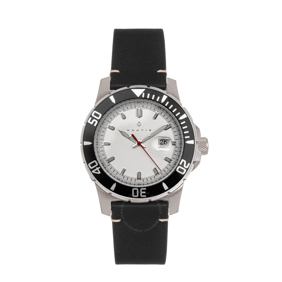 Band Color: Black Genuine Leather; Band Width: 22mm near case; 20mm near clasp/buckle; Bezel Color: Black; Case: Silver + Circle-Shaped; Case Finish: Brushed + Stainless Steel; Case Thickness: 14mm; Case Width: 45mm; 51mm with Crown; Clasp / Buckle: Strap Buckle; Dial: White + Analog; Hand Color: Silver; Movement: Japanese + Quartz; Time Zones: Single; Water Resistance: 20 ATM. Silver-tone stainless steel case with a black genuine leather strap. Uni-directional rotating black stainless steel bezel. White dial with silver-tone hands and index hour markers. Minute markers around the outer rim. Dial Type: Analog. Luminescent hands and markers. Date display at the 3 o'clock position. Quartz movement. Scratch resistant mineral crystal. Pull / push crown. Solid case back. Round case shape, case size: 45 mm, case thickness: 14 mm. Band width: 22 mm, band length: 9 inches. Buckle clasp. Water resistant at 200 meters / 660 feet. Functions: date, hour, minute, second. Dive Pro 200 Series. Casual watch style. Watch label: Japan Movt. Nautis Dive Pro 200 Quartz White Dial Men's Watch GL1909-B. GENERAL Box Type: Original Box CASE Case Size: 45 Case Thickness: 14 mm Case Material: Stainless Steel Case Shape: Round Case Back: Solid BAND Band Material: Genuine Leather Band Type: Strap Band Color: Black Band Length: 9 inches Band Width: 22 mm Clasp: Buckle DIAL Dial Color: White Type: Analog Crystal: Scratch Resistant Mineral Hands: Silver-tone Dial Markers: Index Second Markers: Minute Markers around the outer rim Luminiscence: Hands and Markers Bezel: Uni-directional Rotating Bezel Color: Black Bezel Material: Stainless Steel Crown: Pull / Push INFORMATION Brand: Nautis Series: Dive Pro 200 Collection Name: Dive Pro 200 Gender: Mens Model: GL1909-B Watch Label: Japan Movt Movement: Quartz FEATURES Water Resistance: 200 meters / 660 feet Calendar: Date display at the 3 o'clock position Functions: Date, Hour, Minute, Second Watch Features: Analog, Leather, Stainless Steel, Time Zone ADDITIONAL INFO Watch Style: Casual Warranty: With Manufacturers Guarantee UPC Code: 847864199743 Jomashop Sku: Y-150883 Department: Watches Category: Watches