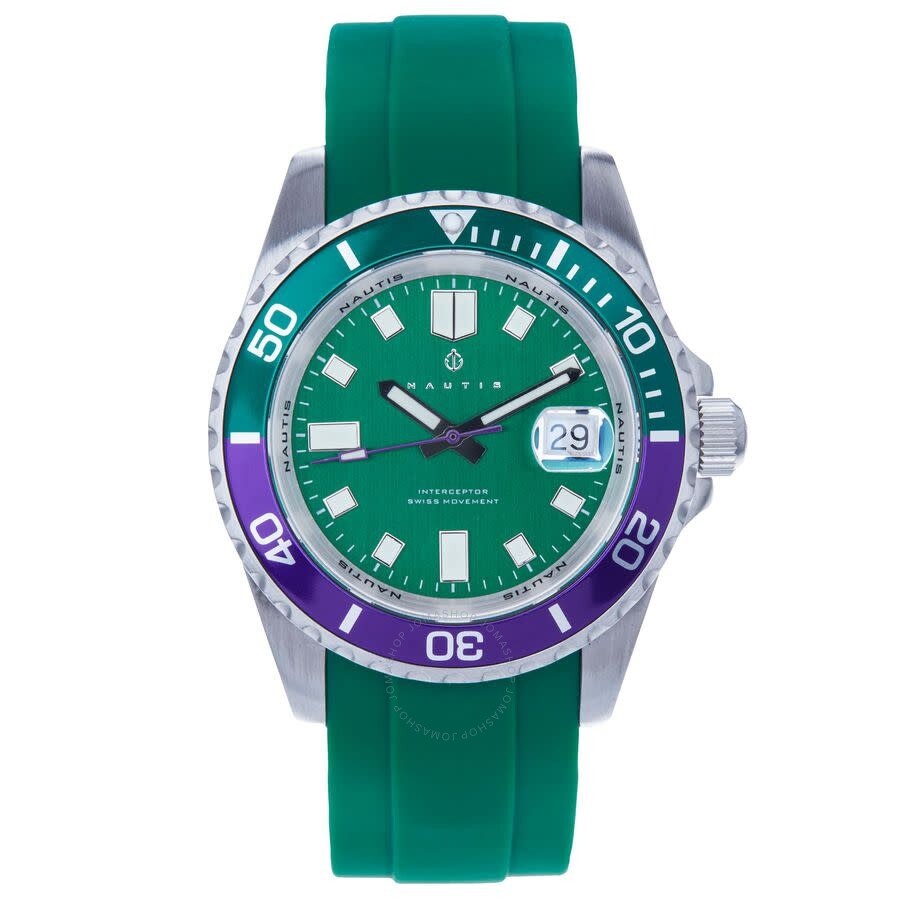 Band Color: Green Rubber; Band Width: 22mm near case; 22mm near clasp/buckle; Bezel Color: Green & Purple; Case: Silver + Circle-Shaped; Case Finish: Brushed + Stainless Steel; Case Thickness: 14mm; Case Width: 43mm; 47mm with Crown; Clasp / Buckle: Strap Buckle; Dial: Green + Analog; Hand Color: Silver; Movement: Swiss + Quartz; Time Zones: Single; Water Resistance: 50 ATM. INFORMATION Brand: Nautis Series: Interceptor Collection Name: Interceptor Gender: Mens Model: 19161G-H Movement: Quartz CASE Case Size: 43 mm Case Thickness: 14 mm Case Material: Stainless Steel Case Shape: Round Case Back: Solid BAND Band Material: Rubber Band Type: Strap Band Color: Green Band Length: 8.75 inches Band Width: 22 mm Clasp: Buckle DIAL Dial Color: Green Type: Analog Crystal: Scratch Resistant Mineral Hands: Silver-tone Dial Markers: Index Second Markers: Minute Markers around the outer rim Luminiscence: Hands and Markers Bezel: Uni-directional Rotating Bezel Color: Multi-Color Bezel Material: Stainless Steel Crown: Screw Down FEATURES Water Resistance: 500 meters / 1650 feet Calendar: Date display at the 3 o'clock position Functions: Date, Hour, Minute, Second Watch Features: Time Zone, Stainless Steel, Rubber, Analog ADDITIONAL INFO Watch Style: Casual Warranty: With Manufacturers Guarantee UPC Code: 840148807105 Jomashop Sku: Y-A2EJ5 Department: Watches Category: Watches