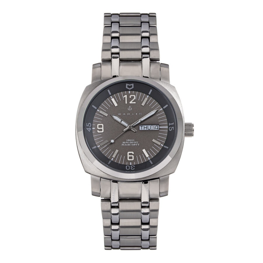 Stainless steel case with a stainless steel bracelet. Fixed stainless steel bezel. Grey dial with luminous silver-tone hands and index hour markers. Arabic numerals appear at the 6, 9 and 12 o'clock positions. Minute markers around the outer rim. Dial Type: Analog. Luminescent hands and markers. Day of the week and date display at the 3 o'clock position. Quartz movement. Scratch resistant mineral crystal. Pull / push crown. Solid case back. Cushion case shape. Case size: 45 mm. Case thickness: 15 mm. Band width: 24 mm. Band length: 9 inches. Deployment clasp with a push button release. Water resistant at 200 meters / 660 feet. Functions: date, day, hour, minute, second. Stealth Series. Casual watch style. Watch label: Swiss Made. Nautis Stealth Quartz Grey Dial Men's Watch GL2087-G. INFORMATION Brand: Nautis Series: Stealth Collection Name: Stealth Gender: Mens Model: GL2087-G Watch Label: Swiss Made Movement: Quartz CASE Case Size: 45 mm Case Thickness: 15 mm Case Material: Stainless Steel Case Shape: Cushion Case Back: Solid BAND Band Material: Stainless Steel Band Type: Bracelet Band Color: Silver-tone Band Length: 9 inches Band Width: 24 mm Clasp: Deployment with Push Button Release DIAL Dial Color: Grey Type: Analog Crystal: Scratch Resistant Mineral Hands: Luminous Silver-tone Dial Markers: Index Second Markers: Arabic Numeral Marker appears at the 6, 9 and 12 o'clock positions. Minute Markers around the outer rim Luminiscence: Hands and Markers Bezel: Fixed Bezel Color: Silver-tone Bezel Material: Stainless Steel Crown: Pull / Push FEATURES Water Resistance: 200 meters / 660 feet Calendar: Day of the Week and Date display at the 3 o'clock position Functions: Date, Day, Hour, Minute, Second Watch Features: Stainless Steel, Analog ADDITIONAL INFO Watch Style: Casual Warranty: With Manufacturers Guarantee UPC Code: 847864197107 Jomashop Sku: Y-151383 Department: Watches Category: Watches
