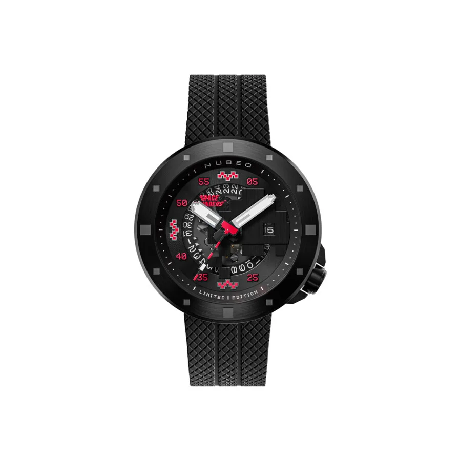 Continuing the bold evolution of gaming-inspired series, this limited edition of the Cassini family takes a darker turn with an all-black design complemented by vibrant, colorful accents on the indices and hands. The result? A stealthy, futuristic look that nods to the endless battles of intergalactic gameplay. Black stainless steel case with a black silicone strap. Fixed black stainless steel bezel. Black dial with silver-tone hands and index hour markers. Minute markers around the outer rim. Dial Type: Analog. Luminescent hands. Date display at the 3 o'clock position. SII-NH35 automatic movement. Scratch resistant sapphire crystal. Pull / push crown. Transparent case back. Round case shape, case size: 50 mm, case thickness: 14 mm. Band width: 24 mm, band length: 8 inches. Buckle clasp. Water resistant at 50 meters / 165 feet. Functions: date, hour, minute, second. Cassini Series. Casual watch style. Watch label: Japan Movement. Nubeo Cassini Black Dial Men's Watch NB-6103-08. GENERAL Box Type: Original Box CASE Case Diameter: 50 mm Case Thickness: 14 mm Case Material: Stainless Steel Case Shape: Round Case Back: Transparent BAND Band Material: Silicone Band Type: Strap Band Color: Black Band Length: 8 inches Band Width: 24 mm Clasp: Buckle DIAL Dial Color: Black Type: Analog Crystal: Scratch Resistant Sapphire Hands: Silver-tone Dial Markers: Index Second Markers: Minute Markers around the outer rim Luminiscence: Hands Bezel: Fixed Bezel Color: Black Bezel Material: Stainless Steel Crown: Pull / Push INFORMATION Brand: Nubeo Series: Cassini Collection Name: Cassini Gender: Mens Model: NB-6103-08 Watch Label: Japan Movement Movement: Automatic Engine: SII-NH35 FEATURES Water Resistance: 50 meters / 165 feet Calendar: Date display at the 3 o'clock position Functions: Date, Hour, Minute, Second Watch Features: Stainless Steel, Analog ADDITIONAL INFO Watch Style: Casual Warranty: With Manufacturers Guarantee UPC Code: 194595071054 Jomashop Sku: Y-A5MPX Department: Watches