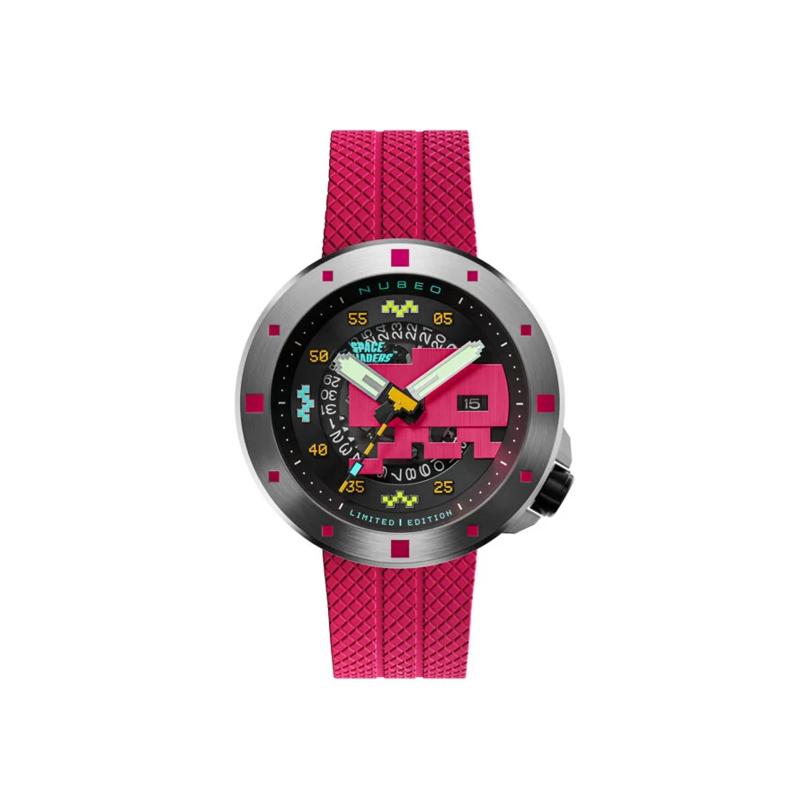 Continuing the bold evolution of gaming-inspired series, this limited edition of the Cassini family takes a darker turn with an all-black design complemented by vibrant, colorful accents on the indices and hands. The result? A stealthy, futuristic look that nods to the endless battles of intergalactic gameplay. Silver-tone stainless steel case with a red silicone strap. Fixed silver-tone stainless steel bezel. Red dial with silver-tone hands and index hour markers. Minute markers around the outer rim. Dial Type: Analog. Luminescent hands. Date display at the 3 o'clock position. SII-NH35 automatic movement. Scratch resistant sapphire crystal. Pull / push crown. Transparent case back. Round case shape, case size: 50 mm, case thickness: 14 mm. Band width: 24 mm, band length: 8 inches. Buckle clasp. Water resistant at 50 meters / 165 feet. Functions: date, hour, minute, second. Cassini Series. Casual watch style. Watch label: Japan Movement. Nubeo Cassini Red Dial Men's Watch NB-6103-03. GENERAL Box Type: Original Box CASE Case Diameter: 50 mm Case Thickness: 14 mm Case Material: Stainless Steel Case Shape: Round Case Back: Transparent BAND Band Material: Silicone Band Type: Strap Band Color: Red Band Length: 8 inches Band Width: 24 mm Clasp: Buckle DIAL Dial Color: Red Type: Analog Crystal: Scratch Resistant Sapphire Hands: Silver-tone Dial Markers: Index Second Markers: Minute Markers around the outer rim Luminiscence: Hands Bezel: Fixed Bezel Color: Silver-tone Bezel Material: Stainless Steel Crown: Pull / Push INFORMATION Brand: Nubeo Series: Cassini Collection Name: Cassini Gender: Mens Model: NB-6103-03 Watch Label: Japan Movement Movement: Automatic Engine: SII-NH35 FEATURES Water Resistance: 50 meters / 165 feet Calendar: Date display at the 3 o'clock position Functions: Date, Hour, Minute, Second Watch Features: Stainless Steel, Analog ADDITIONAL INFO Watch Style: Casual Warranty: With Manufacturers Guarantee UPC Code: 194595071009 Jomashop Sku: Y-A5MTH Department: Watches