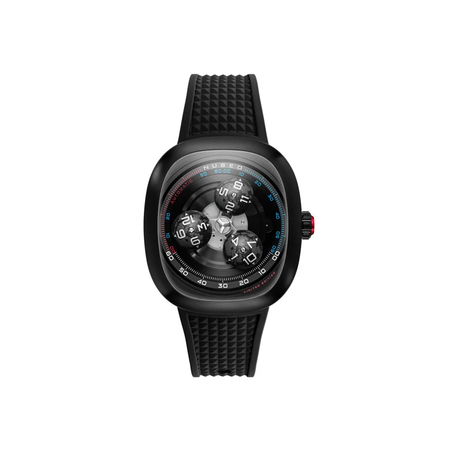 A visual spectacle as captivating as the cosmos itself. At the heart of this timepiece lies a custom-engineered wandering hours complication. Unlike traditional time displays, the three dome-shaped hour hands emulate stars in orbit — each sculpted with surface textures reminiscent of celestial bodies, revolving dynamically around a central carousel to mark the passage of time. Black stainless steel case with a black rubber strap. Fixed black stainless steel bezel. Black dial with index hour markers. Minute markers around the outer rim. Dial Type: Analog. MIY-9039 automatic movement. Scratch resistant mineral crystal. Screw down crown. Transparent case back. Oval case shape, case size: 46 mm, case thickness: 21 mm. Band width: 20 mm, band length: 8 inches. Fold over clasp. Water resistant at 50 meters / 165 feet. Functions: hour, minute, second. Tri-star Orbit Series. Casual watch style. Watch label: Japan Movement. Nubeo Tri-Star Orbit Black Dial Men's Watch NB-6116-01. GENERAL Box Type: Original Box CASE Case Diameter: 46 mm Case Thickness: 21 mm Case Material: Stainless Steel Case Shape: Oval Case Back: Transparent BAND Band Material: Rubber Band Type: Strap Band Color: Black Band Length: 8 inches Band Width: 20 mm Clasp: Fold Over DIAL Dial Color: Black Type: Analog Crystal: Scratch Resistant Mineral Dial Markers: Index Second Markers: Minute Markers around the outer rim Bezel: Fixed Bezel Color: Black Bezel Material: Stainless Steel Crown: Screw Down INFORMATION Brand: Nubeo Series: Tri-Star Orbit Collection Name: Tri-Star Orbit Gender: Mens Model: NB-6116-01 Watch Label: Japan Movement Movement: Automatic Engine: MIY-9039 FEATURES Water Resistance: 50 meters / 165 feet Functions: Hour, Minute, Second Watch Features: Analog, Rubber, Stainless Steel ADDITIONAL INFO Watch Style: Casual Warranty: With Manufacturers Guarantee UPC Code: 194595076110 Jomashop Sku: Y-A5MR3 Department: Watches