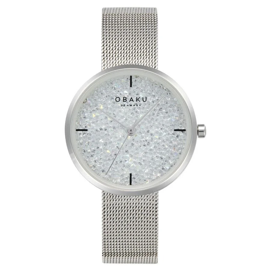 Silver-tone stainless steel case and bracelet. Fixed silver-tone stainless steel bezel. White dial with silver-tone hands and index hour markers. Dial Type: Analog. Quartz movement. Scratch resistant mineral crystal. Round case shape, case size: 32 mm, case thickness: 10 mm. Band width: 14 mm, band length: 7.5 inches. Fold over clasp with a safety release. Water resistant at 30 meters / 100 feet. Functions: hour, minute, second. Glimmer Series. Fashion watch style. Obaku Glimmer Quartz White Dial Ladies Watch V289LHCWMC. GENERAL Box Type: Original Box CASE Case Diameter: 32 mm Case Thickness: 10 mm Case Material: Stainless Steel Case Shape: Round BAND Band Material: Stainless Steel Band Type: Bracelet Band Color: Silver-tone Band Length: 7.5 inches Band Width: 14 mm Clasp: Fold Over with Safety Release DIAL Dial Color: White Type: Analog Crystal: Scratch Resistant Mineral Hands: Silver-tone Dial Markers: Index Bezel: Fixed Bezel Color: Silver-tone Bezel Material: Stainless Steel INFORMATION Brand: Obaku Series: Glimmer Collection Name: Glimmer Gender: Womens Model: V289LHCWMC Movement: Quartz FEATURES Water Resistance: 30 meters / 100 feet Functions: Hour, Minute, Second Watch Features: Stainless Steel, Analog ADDITIONAL INFO Watch Style: Fashion UPC Code: 889034809106 Jomashop Sku: Y-A5L6E Department: Watches