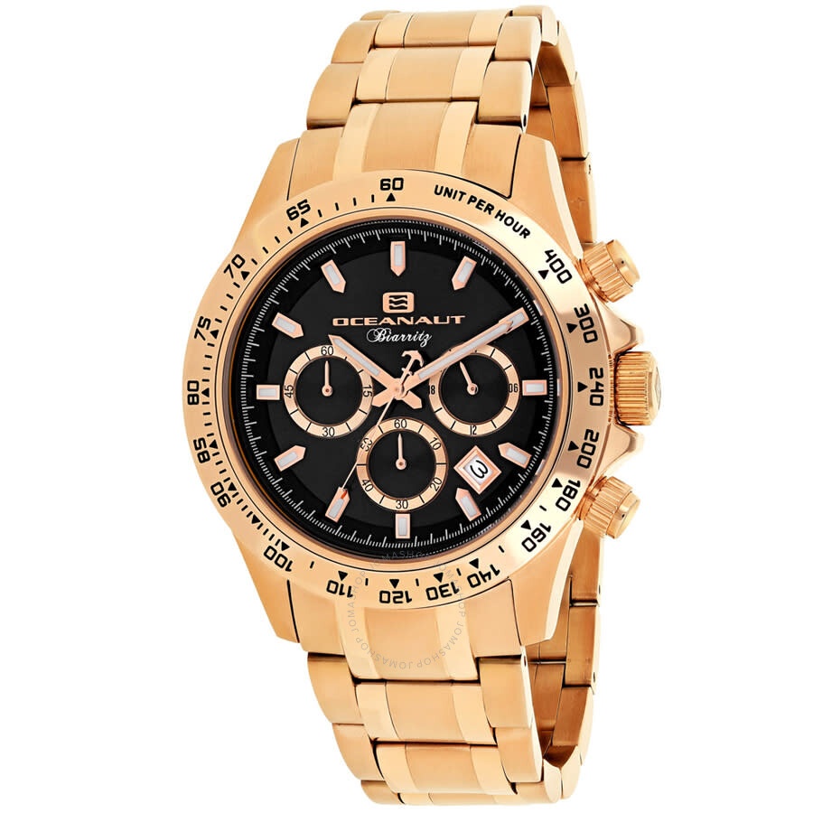 Rose gold-tone stainless steel case and bracelet. Fixed rose gold-tone stainless steel bezel. Black dial with rose gold-tone hands and index hour markers. Minute markers around the outer rim. Dial Type: Analog. Luminescent hands and markers. Date display between 4 and 5 o'clock position. Chronograph - three sub-dials displaying: 60 second, 60 minute and 24 hour. Quartz movement. Scratch resistant mineral crystal. Round case shape, case size: 44 mm. Band width: 20 mm. Fold over clasp. Water resistant at 100 meters / 330 feet. Functions: chronograph, date, hour, minute, second. Biarritz Series. Fashion watch style. Oceanaut Biarritz Chronograph Quartz Black Dial Men's Watch OC6119. INFORMATION Brand: Oceanaut Series: Biarritz Collection Name: Biarritz Gender: Mens Model: OC6119 Movement: Quartz CASE Case Size: 44 mm Case Material: Stainless Steel Case Shape: Round BAND Band Material: Stainless Steel Band Type: Bracelet Band Color: Rose Gold-tone Band Width: 20 mm Clasp: Fold Over DIAL Dial Color: Black Type: Analog Crystal: Scratch Resistant Mineral Hands: Rose Gold-tone Dial Markers: Index Second Markers: Minute Markers around the outer rim Sub Dials: Three - 60 Second, 60 Minute and 24 Hour Luminiscence: Hands and Markers Bezel: Fixed Bezel Color: Rose Gold-tone Bezel Material: Stainless Steel FEATURES Water Resistance: 100 meters / 330 feet Calendar: Date display between 4 and 5 o'clock position Functions: Chronograph, Date, Hour, Minute, Second Watch Features: Chronograph, Stainless Steel, Gold, Analog ADDITIONAL INFO Watch Style: Fashion Warranty: With Manufacturers Guarantee UPC Code: 650270967451 Jomashop Sku: ON-OC6119 Department: Watches Category: Watches