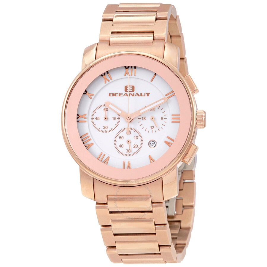 Rose gold-tone stainless steel case and bracelet. Fixed rose gold-tone bezel. White dial with luminous rose gold-tone hands and Roman numeral hour markers. Dial Type: Analog. Luminescent hands. Date display between the 4 and 5 o'clock positions. Chronograph - three sub-dials displaying: 60 second, 60 minute and 24 hour. Quartz movement. Scratch resistant mineral crystal. Pull / push crown. Solid case back. Round case shape. Case size: 44 mm. Band width: 22 mm. Deployment clasp with a push button release. Water resistant at 50 meters / 165 feet. Functions: chronograph, date, hour, minute, second. Riviera Series. Fashion watch style. Oceanaut Riviera Chronograph Quartz White Dial Men's Watch OC0334. INFORMATION Brand: Oceanaut Series: Riviera Collection Name: Riviera Gender: Mens Model: OC0334 Movement: Quartz CASE Case Size: 44 mm Case Material: Stainless Steel Case Shape: Round Case Back: Solid BAND Band Material: Stainless Steel Band Type: Bracelet Band Color: Rose Gold-tone Band Width: 22 mm Clasp: Deployment with Push Button Release DIAL Dial Color: White Type: Analog Crystal: Scratch Resistant Mineral Hands: Luminous Rose Gold-tone Dial Markers: Roman Numeral Sub Dials: Three - 60 Second, 60 Minute and 24 Hour Luminiscence: Hands Bezel: Fixed Bezel Color: Rose Gold-tone Bezel Material: Stainless Steel Crown: Pull / Push FEATURES Water Resistance: 50 meters / 165 feet Calendar: Date display between the 4 and 5 o'clock positions Functions: Chronograph, Date, Hour, Minute, Second Watch Features: Chronograph, Stainless Steel, Gold, Analog ADDITIONAL INFO Watch Style: Fashion Warranty: With Manufacturers Guarantee UPC Code: 650270968069 Jomashop Sku: ON-OC0334 Department: Watches Category: Watches