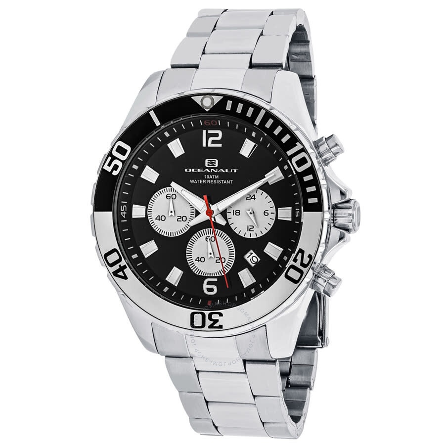 Silver-tone stainless steel case and bracelet. Fixed stainless steel bezel. Black dial with silver-tone hands and index hour markers. Minute markers around the outer rim. Dial Type: Analog. Luminescent hands and markers. Date display between 4 and 5 o'clock position. Chronograph - three sub-dials displaying: 60 second, 60 minute and 24 hour. Quartz movement. Scratch resistant mineral crystal. Round case shape, case size: 45 mm. Band width: 20 mm. Fold over clasp. Water resistant at 100 meters / 330 feet. Functions: chronograph, date, hour, minute, second. Sevilla Series. Fashion watch style. Oceanaut Sevilla Chronograph Quartz Black Dial Men's Watch OC2524. INFORMATION Brand: Oceanaut Series: Sevilla Collection Name: Sevilla Gender: Mens Model: OC2524 Movement: Quartz CASE Case Size: 45 mm Case Material: Stainless Steel Case Shape: Round BAND Band Material: Stainless Steel Band Type: Bracelet Band Color: Silver-tone Band Width: 20 mm Clasp: Fold Over DIAL Dial Color: Black Type: Analog Crystal: Scratch Resistant Mineral Hands: Silver-tone Dial Markers: Index Second Markers: Minute Markers around the outer rim Sub Dials: Three - 60 Second, 60 Minute and 24 Hour Luminiscence: Hands and Markers Bezel: Fixed Bezel Material: Stainless Steel FEATURES Water Resistance: 100 meters / 330 feet Calendar: Date display between 4 and 5 o'clock position Functions: Chronograph, Date, Hour, Minute, Second Watch Features: Chronograph, Stainless Steel, Analog ADDITIONAL INFO Watch Style: Fashion Warranty: With Manufacturers Guarantee UPC Code: 641612953867 Jomashop Sku: ON-OC2524 Department: Watches Category: Watches
