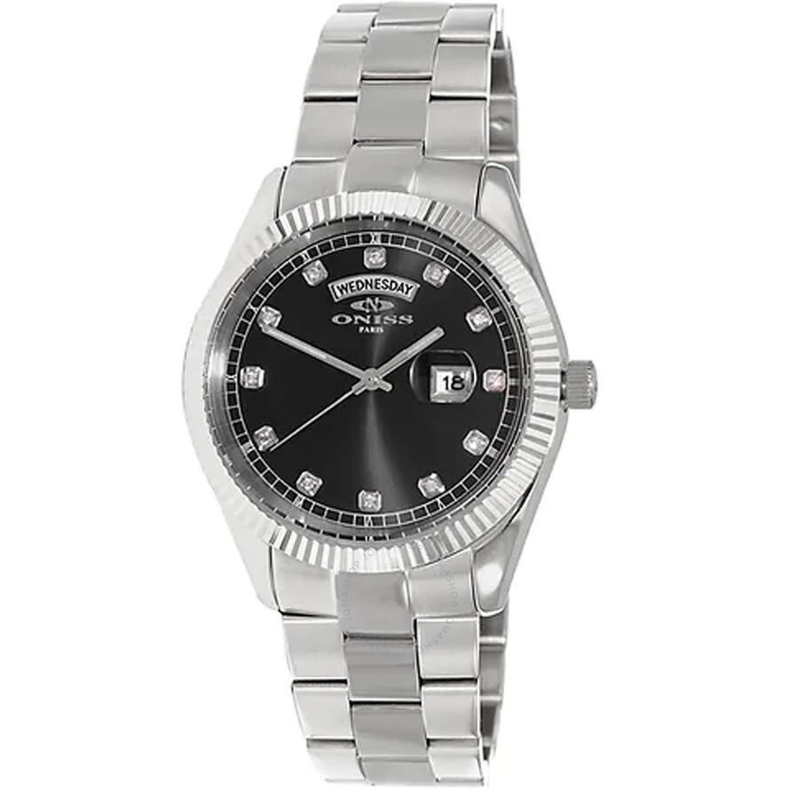 Men's Watch, Silver tone All Stainless Steel Case an Band, w/ Fold-over deployment w/ safety clasp , Sunray Black Dial, with Day-Date Display, Accented with Austrian Crystal, Silver tone with luminous hour indicator hour and second hand. Screw-down Crown, Mineral Crystal INFORMATION Brand: Oniss Series: Onz3881 Collection Name: ONZ3881 Gender: Mens Model: ON3881-MBK Watch Label: Japan Movemet, (VX44) Movement: Quartz CASE Case Size: 42 mm Case Thickness: 13.25 mm Case Material: Stainless Steel Case Shape: Round Case Back: Solid BAND Band Material: Stainless Steel Band Type: Bracelet Band Color: Silver-tone Band Length: 7 inches Band Width: 22 mm Clasp: Deployment with Push Button Release DIAL Dial Color: Black Type: Analog Crystal: Scratch Resistant Mineral Dial Markers: Index Luminiscence: Hands Bezel: Fixed Bezel Color: Silver-tone Bezel Material: Stainless Steel Crown: Screw Down FEATURES Water Resistance: 50 meters / 165 feet Calendar: Day / Date Functions: Calendar Watch Features: Stainless Steel, Analog ADDITIONAL INFO Watch Style: Dress Warranty: With Manufacturers Guarantee Jomashop Sku: Y-A29FS Department: Watches Category: Watches
