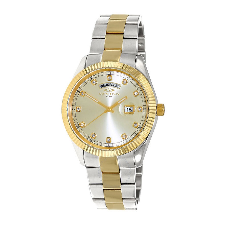 Men's Watch, 2-tone Gold All Stainless Steel Case an Band, w/ Fold-over deployment w/ safety clasp , Sunray Goldtone Dial, with Day-Date Display, Accented with Austrian Crystal, Gold tone with luminous hour indicator hour and second hand. Screw-down Crown, Mineral Crystal INFORMATION Brand: Oniss Series: Onz3881 Collection Name: ONZ3881 Gender: Mens Model: ON3881-2TGD Watch Label: Japan Movemet, (VX44) Movement: Quartz Engine: (VX44) JAPAN CASE Case Size: 42 mm Case Thickness: 13.25 mm Case Material: Stainless Steel Case Shape: Round Case Back: Solid BAND Band Material: Stainless Steel Band Type: Bracelet Band Color: Two-tone Band Length: 7 inches Band Width: 22 mm Clasp: Deployment with Push Button Release DIAL Dial Color: Gold-tone Type: Analog Crystal: Scratch Resistant Mineral Dial Markers: Index Luminiscence: Hands Bezel: Fixed Bezel Color: Gold-tone Bezel Material: Stainless Steel Crown: Screw Down FEATURES Water Resistance: 50 meters / 165 feet Calendar: Day / Date Functions: Calendar Watch Features: Stainless Steel, Gold, Analog ADDITIONAL INFO Watch Style: Dress Warranty: With Manufacturers Guarantee Jomashop Sku: Y-A29FB Department: Watches Category: Watches