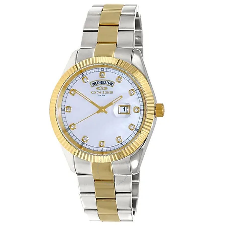 Men's Watch, 2-tone Gold All Stainless Steel Case an Band, w/ Fold-over deployment w/ safety clasp , White (MOP) Mother of Pearl Dial, with Day-Date Display, Accented with Austrian Crystal, Gold tone with luminous hour indicator hour and second hand. Screw-down Crown, Mineral Crystal INFORMATION Brand: Oniss Series: Onz3881 Collection Name: ONZ3881 Gender: Mens Model: ON3881-2TWT Watch Label: Japan Movemet, (VX44) Movement: Quartz Engine: (VX44) JAPAN CASE Case Size: 42 mm Case Thickness: 13.25 mm Case Material: Stainless Steel Case Shape: Round Case Back: Solid BAND Band Material: Stainless Steel Band Type: Bracelet Band Color: Two-tone Band Length: 7 inches Band Width: 22 mm Clasp: Deployment with Push Button Release DIAL Dial Color: White Type: Analog Crystal: Scratch Resistant Mineral Dial Markers: Index Luminiscence: Hands Bezel: Fixed Bezel Color: Gold-tone Bezel Material: Stainless Steel Crown: Screw Down FEATURES Water Resistance: 50 meters / 165 feet Calendar: Day / Date Functions: Calendar Watch Features: Stainless Steel, Gold, Analog ADDITIONAL INFO Watch Style: Dress Warranty: With Manufacturers Guarantee Jomashop Sku: Y-A29FQ Department: Watches Category: Watches