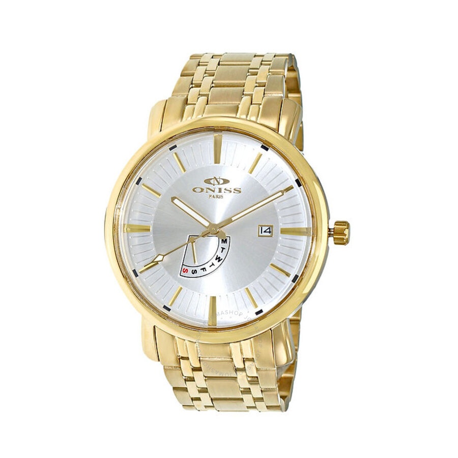 Yellow gold-tone stainless steel case and bracelet. Fixed yellow gold-tone stainless steel bezel. White dial with yellow gold-tone hands and index hour markers. Minute markers around the outer rim. Dial Type: Analog. Luminescent hands. Day / date. VX46E quartz movement. Scratch resistant acrylic crystal. Pull / push crown. Solid case back. Round case shape, case size: 44.0 mm, case thickness: 13.5 mm. Band width: 24.0 mm, band length: 7.0 inches. Fold over with double push button release clasp. Water resistant at 3 meters / 10 feet. Functions: date, day, hour, minute, second. Sorrento Series. Casual watch style. Watch label: Japan Movt. Oniss Sorrento Quartz White Dial Men's Watch ON2626-MGWT. INFORMATION Brand: Oniss Series: Sorrento Collection Name: Sorrento Gender: Mens Model: ON2626-MGWT Watch Label: Japan Movt Movement: Quartz Engine: VX46E CASE Case Size: 44.0 mm Case Thickness: 13.5 mm Case Material: Stainless Steel Case Shape: Round Case Back: Solid BAND Band Material: Stainless Steel Band Type: Bracelet Band Color: Yellow Gold-tone Band Length: 7.0 inches Band Width: 24.0 mm Clasp: Fold Over with Double Push Button Release DIAL Dial Color: White Type: Analog Crystal: Acrylic Hands: Yellow Gold-tone Dial Markers: Index Second Markers: Minute Markers around the outer rim Luminiscence: Hands Bezel: Fixed Bezel Color: Yellow Gold-tone Bezel Material: Stainless Steel Crown: Pull / Push FEATURES Water Resistance: 3 meters / 10 feet Calendar: Day / Date Functions: Date, Day, Hour, Minute, Second Watch Features: Stainless Steel, Gold, Analog ADDITIONAL INFO Watch Style: Casual Warranty: With Manufacturers Guarantee UPC Code: 815096401965 Jomashop Sku: Y-A2G3R Department: Watches Category: Watches