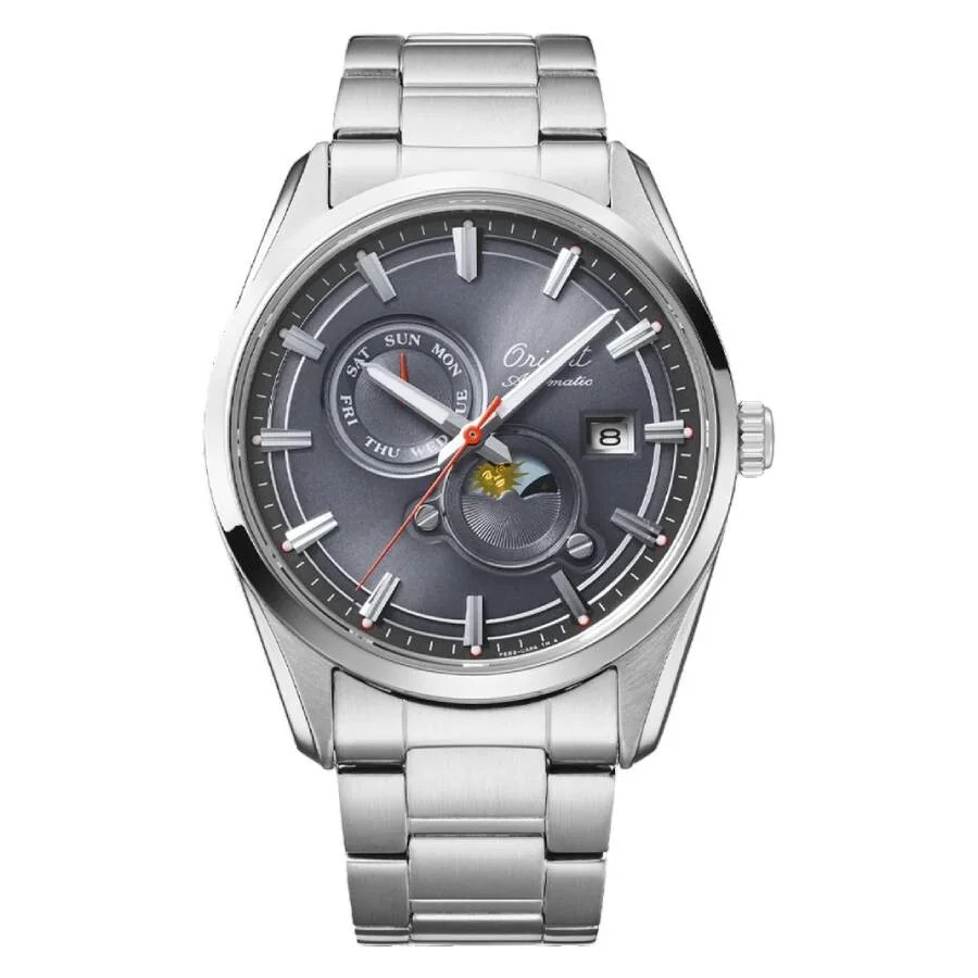 Silver-tone stainless steel case and bracelet. Fixed silver-tone stainless steel bezel. Grey dial with silver-tone hands and index hour markers. Minute markers around the outer rim. Dial Type: Analog. Date display at the 3 o'clock position. Two sub-dials displaying: day and day/night indicator. Orient Calibre F6B24 Automatic movement, containing 22 Jewels, bitting at 21600 vph, and has a power reserve of approximately 40 hours. Scratch resistant sapphire crystal. Pull / push crown. Transparent see through case back. Round case shape, case size: 41.5 mm, case thickness: 13 mm. Band width: 22 mm. Fold over clasp with a safety release. Water resistant at 50 meters / 165 feet. Functions: date, day, hour, minute, second, day/night indicator. Contemporary Series. Casual watch style. Watch label: Japan Movt. Item Variations: RA-AK0311N. Orient Contemporary 75th Anniversary Automatic Day-Night Grey Dial Watch RA-AK0311N30B. GENERAL Box Type: Original Box CASE Case Diameter: 41.5 mm Case Thickness: 13 mm Case Material: Stainless Steel Case Shape: Round Case Back: Transparent See Through BAND Band Material: Stainless Steel Band Type: Bracelet Band Color: Silver-tone Band Width: 22 mm Clasp: Fold Over with Safety Release DIAL Dial Color: Grey Type: Analog Crystal: Scratch Resistant Sapphire Hands: Silver-tone Dial Markers: Index Second Markers: Minute Markers around the outer rim Sub Dials: Two - Day and Day/Night Indicator Bezel: Fixed Bezel Color: Silver-tone Bezel Material: Stainless Steel Crown: Pull / Push INFORMATION Brand: Orient Series: Contemporary Collection Name: Contemporary Gender: Mens Model: RA-AK0311N30B Watch Label: Japan Movt Movement: Automatic Engine: Orient Calibre F6B24 Power Reserve: 40 hours FEATURES Water Resistance: 50 meters / 165 feet Calendar: Date display at the 3 o'clock position Functions: Date, Day, Hour, Minute, Second, Day/Night Indicator Watch Features: Analog, Day/Night Indicator, Stainless Steel ADDITIONAL INFO Watch Style: Casual Warranty: 1 Year Jomashop Warranty Jomashop Sku: ONTRA-AK0311N30B Item Variation: RA-AK0311N Department: Watches
