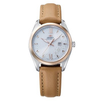 Silver-tone stainless steel case with a leather strap. Fixed rose gold-tone stainless steel bezel. White dial with rose gold-tone hands and index-Roman numeral hour markers. Minute markers around the outer rim. Dial Type: Analog. Date display at the 3 o'clock position. Orient Calibre VS224 eco-drive movement. Scratch resistant sapphire crystal. Pull / push crown. Solid case back. Round case shape, case size: 32.1 mm, case thickness: 7.1 mm. Band width: 16 mm. Buckle clasp. Water resistant at 50 meters / 165 feet. Functions: date, hour, minute, second. Contemporary Series. Casual watch style. Watch label: Japan Movt. Item Variations: RA-WG0604S. Orient Contemporary Solar-Powered White Dial Watch RA-WG0604S10B. GENERAL Box Type: Original Box CASE Case Diameter: 32.1 mm Case Thickness: 7.1 mm Case Material: Stainless Steel Case Shape: Round Case Back: Solid BAND Band Material: Leather Band Type: Strap Band Width: 16 mm Clasp: Buckle DIAL Dial Color: White Type: Analog Crystal: Scratch Resistant Sapphire Hands: Rose Gold-tone Dial Markers: Index-Roman Numeral Second Markers: Minute Markers around the outer rim Bezel: Fixed Bezel Color: Rose Gold-tone Bezel Material: Stainless Steel Crown: Pull / Push INFORMATION Brand: Orient Series: Contemporary Collection Name: Contemporary Gender: Womens Model: RA-WG0604S10B Watch Label: Japan Movt Movement: Eco-Drive Engine: Orient Calibre VS224 FEATURES Water Resistance: 50 meters / 165 feet Calendar: Date display at the 3 o'clock position Functions: Date, Hour, Minute, Second Watch Features: Analog, Solar, Gold, Leather, Stainless Steel ADDITIONAL INFO Watch Style: Casual Warranty: 1 Year Jomashop Warranty Jomashop Sku: ONTRA-WG0604S10B Item Variation: RA-WG0604S Department: Watches