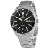 Stainless steel case wiuth a stainless steel bracelet. Uni-directional rotating stainless steel bezel with an inlaid black ring. Black dial with silver-tone hands and index hour markers. Minute markers around the outer rim. Dial Type: Analog. Luminescent hands and markers. Day of the week and date display at the 3 o'clock position. Orient calibre F6922 automatic movement, containing 22 Jewels, bitting at 21600 vph, and has a power reserve of approximately 40 hours. Scratch resistant mineral crystal. Screw down crown. Solid case back. Round case shape. Case size: 44 mm. Case thickness: 12.9 mm. Band width: 22 mm. Fold over clasp with a safety release. Water resistant at 200 meters / 660 feet. Functions: date, day, hour, minute, second. Kanno Series. Dive watch style. Watch label: Japan Movt. Orient Kanno Automatic Black Dial Men's Watch RA-AA0008B19A. INFORMATION Brand: Orient Series: Kanno Collection Name: Kanno Gender: Mens Model: RA-AA0008B19A Watch Label: Japan Movt Movement: Automatic Engine: Orient Calibre F6922 Power Reserve: 40 CASE Case Size: 44 mm Case Thickness: 12.9 mm Case Material: Stainless Steel Case Shape: Round Case Back: Solid BAND Band Material: Stainless Steel Band Type: Bracelet Band Color: Silver-tone Band Width: 22 mm Clasp: Fold Over with Safety Release DIAL Dial Color: Black Type: Analog Crystal: Scratch Resistant Mineral Hands: Luminous Silver-tone Dial Markers: Index Second Markers: Minute Markers around the outer rim Luminiscence: Hands and Markers Bezel: Uni-directional Rotating Bezel Color: Silver-tone Bezel Material: Stainless Steel with an inlaid black ring Crown: Screw Down FEATURES Water Resistance: 200 meters / 660 feet Calendar: Day of the Week and Date display at the 3 o'clock position Functions: Date, Day, Hour, Minute, Second Watch Features: Stainless Steel, Analog ADDITIONAL INFO Watch Style: Dive Warranty: 1 Year Jomashop Warranty UPC Code: 4942715011529 Jomashop Sku: ONTRAAA0008B19A Department: Watches Category: Watches