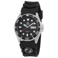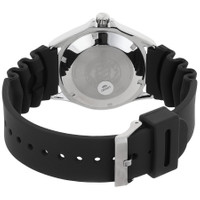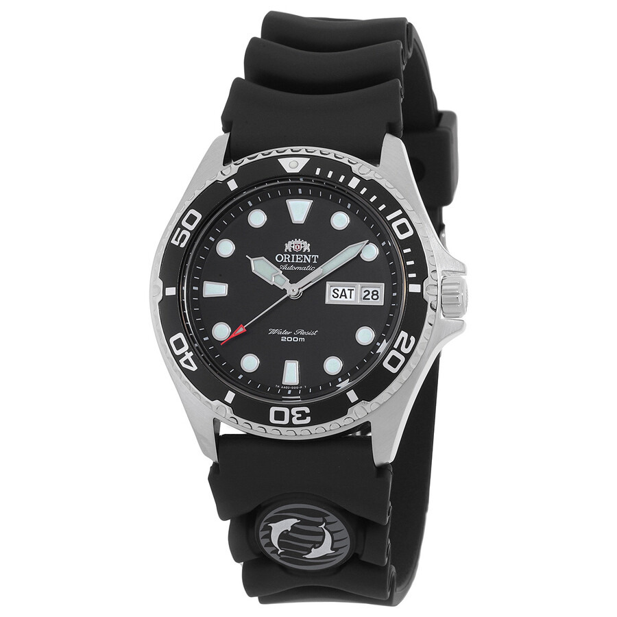 Silver-tone stainless steel case with a black rubber strap. Uni-directional rotating black stainless steel bezel. Black dial with silver-tone hands and index hour markers. Minute markers around the outer rim. Dial Type: Analog. Luminescent hands and markers. Day of the week and date display at the 3 o'clock position. Orient Calibre F6922 Automatic movement, containing 22 Jewels, bitting at 21600 vph, and has a power reserve of approximately 40 hours. Scratch resistant mineral crystal. Screw down crown. Solid case back. Round case shape, case size: 41.5 mm, case thickness: 13 mm. Band width: 22 mm. Buckle clasp. Water resistant at 200 meters / 660 feet. Functions: date, day, hour, minute, second. Sports Series. Sport watch style. Watch label: Japan Movt. Orient Sports Automatic Black Dial Men's Watch TAA02007B. GENERAL Box Type: Original Box CASE Case Size: 41 Case Thickness: 13 mm Case Material: Stainless Steel Case Shape: Round Case Back: Solid BAND Band Material: Rubber Band Type: Strap Band Color: Black Band Width: 22 mm Clasp: Buckle DIAL Dial Color: Black Type: Analog Crystal: Scratch Resistant Mineral Hands: Silver-tone Dial Markers: Index Second Markers: Minute Markers around the outer rim Luminiscence: Hands and Markers Bezel: Uni-directional Rotating Bezel Color: Black Bezel Material: Stainless Steel Crown: Screw Down INFORMATION Brand: Orient Series: Sports Collection Name: Sports Gender: Mens Model: TAA02007B Watch Label: Japan Movt Movement: Automatic Engine: Orient Calibre F6922 Power Reserve: 40 hours FEATURES Water Resistance: 200 meters / 660 feet Calendar: Day of the Week and Date display at the 3 o'clock position Functions: Date, Day, Hour, Minute, Second Watch Features: Analog, Rubber, Stainless Steel ADDITIONAL INFO Watch Style: Sport Warranty: 1 Year Jomashop Warranty Jomashop Sku: Z-2QN7U Department: Watches