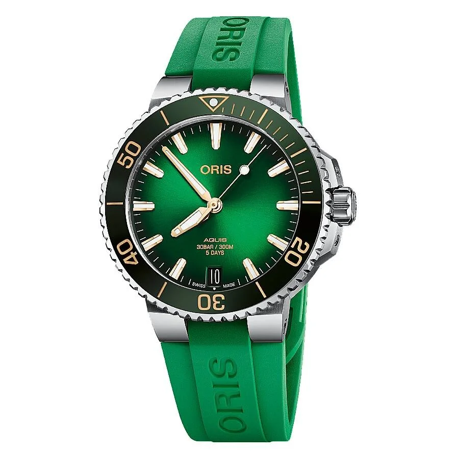 Silver-tone stainless steel case with a green rubber strap. Uni-directional rotating green ceramic bezel. Green dial with index hour markers. Minute markers around the outer rim. Dial Type: Analog. Luminescent hands and markers. Date display at the 6 o'clock position. Oris Calibre 400 Automatic movement, containing 21 Jewels, bitting at 28800 vph, and has a power reserve of approximately 120 hours. Scratch resistant sapphire crystal. Screw down crown. Transparent see through case back. Round case shape, case size: 41.5 mm. Band width: 22 mm. Water resistant at 300 meters / 1000 feet. Functions: date, hour, minute, second. Aquis Date Series. Casual watch style. Watch label: Swiss Made. Oris Aquis Date Automatic Green Dial Men's Watch 01 400 7769 4127-07 4 22 77FC. GENERAL Box Type: Original Box CASE Case Diameter: 41.5 mm Case Material: Stainless Steel Case Shape: Round Case Back: Transparent See Through BAND Band Material: Rubber Band Type: Strap Band Color: Green Band Width: 22 mm DIAL Dial Color: Green Type: Analog Crystal: Scratch Resistant Sapphire Dial Markers: Index Second Markers: Minute Markers around the outer rim Luminiscence: Hands and Markers Bezel: Uni-directional Rotating Bezel Color: Green Bezel Material: Ceramic Crown: Screw Down INFORMATION Brand: Oris Series: Aquis Date Collection Name: Aquis Date Gender: Mens Model: 01 400 7769 4127-07 4 22 77FC Watch Label: Swiss Made Movement: Automatic Engine: Oris Calibre 400 Power Reserve: 120 hours FEATURES Water Resistance: 300 meters / 1000 feet Calendar: Date display at the 6 o'clock position Functions: Date, Hour, Minute, Second Watch Features: Analog, Ceramic, Rubber, Stainless Steel ADDITIONAL INFO Watch Style: Casual Warranty: 2 Year Jomashop Warranty Jomashop Sku: OR0140077694127-074F Department: Watches