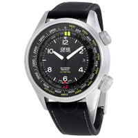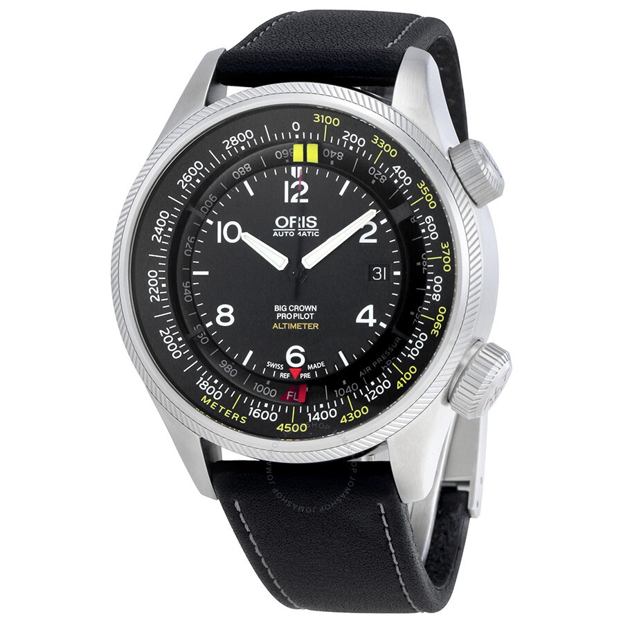 Silver-tone stainless steel case with a black leather strap. Fixed fluted silver-tone stainless steel bezel. Black dial with luminous silver-tone hands and Arabic numeral and index hour markers. Minute markers. altimeter & barometer markings. Dial Type: Analog. Luminescent hands and markers. Date display at the 3 o'clock position. Oris Calibre 733 Automatic movement, based upon Sellita SW200-1, containing 26 Jewels, bitting at 28800 vph, and has a power reserve of approximately 38 hours. Scratch resistant sapphire crystal. Screw down crown. Solid case back. Round case shape, case size: 47 mm, case thickness: 18 mm. Band width: 23 mm. Fold over with safety release clasp. Water resistant at 100 meters / 330 feet. Functions: date, hour, minute, second, altimeter, barometer. Big Crown Altimeter Series. Casual watch style. Watch label: Swiss Made. Oris Big Crown Altimeter Automatic Black Dial Men's Watch 733-7705-4164LS. GENERAL Box Type: Original Box CASE Case Size: 47 Case Thickness: 18 mm Case Material: Stainless Steel Case Shape: Round Case Back: Solid BAND Band Material: Leather Band Type: Strap Band Color: Black Band Width: 23 mm Clasp: Fold Over with Safety Release DIAL Dial Color: Black Type: Analog Crystal: Scratch Resistant Sapphire Hands: Luminous Silver-tone Dial Markers: Arabic Numeral and Index Second Markers: Minute Markers. Altimeter & Barometer Markings Luminiscence: Hands and Markers Bezel: Fixed Fluted Bezel Color: Silver-tone Bezel Material: Stainless Steel Crown: Screw Down INFORMATION Brand: Oris Series: Big Crown Altimeter Collection Name: Big Crown Altimeter Gender: Mens Model: 733-7705-4164LS Watch Label: Swiss Made Movement: Automatic Engine: Oris Calibre 733 Power Reserve: 38 hours FEATURES Water Resistance: 100 meters / 330 feet Calendar: Date display at the 3 o'clock position Functions: Date, Hour, Minute, Second, altimeter, barometer Watch Features: Analog, Leather, Stainless Steel, Altimeter ADDITIONAL INFO Watch Style: Casual Warranty: 2 Year Jomashop Warranty Jomashop Sku: OR733-7705-4164LS Department: Watches Category: Watches