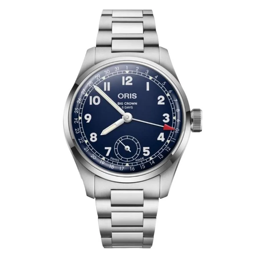 Silver-tone stainless steel case and bracelet. Fixed silver-tone ceramic bezel. Blue dial with silver-tone hands and Arabic numeral hour markers. Minute markers around the outer rim. Dial Type: Analog. Pointer date. One subdial displaying: small. Oris Calibre 403 automatic movement with a 120-hour power reserve. Scratch resistant sapphire crystal. Transparent see through case back. Round case shape, case size: 38 mm. Band width: 19 mm. Folding clasp. Water resistant at 50 meters / 165 feet. Functions: date, hour, minute, small second,. Big Crown Series. Casual watch style. Watch label: Swiss Made. Oris Big Crown Pointer Date Automatic Blue Dial Watch 01 403 7776 4065-07 8 19 06. GENERAL Box Type: Original Box CASE Case Material: Stainless Steel Case Shape: Round Case Back: Transparent See Through BAND Band Material: Stainless Steel Band Type: Bracelet Band Color: Silver-tone Band Width: 19 mm Clasp: Folding DIAL Dial Color: Blue Type: Analog Crystal: Scratch Resistant Sapphire Hands: Silver-tone Dial Markers: Arabic Numeral Second Markers: Minute Markers around the outer rim Sub Dials: One - Small Bezel: Fixed Bezel Color: Silver-tone Bezel Material: Ceramic INFORMATION Brand: Oris Series: Big Crown Collection Name: Big Crown Gender: Mens Model: 01 403 7776 4065-07 8 19 06 Watch Label: Swiss Made Movement: Automatic Engine: Oris Calibre 403 Power Reserve: 120 hours FEATURES Water Resistance: 50 meters / 165 feet Calendar: Pointer Date Functions: Date, Hour, Minute, Small Second, Watch Features: Analog, Ceramic, Stainless Steel ADDITIONAL INFO Watch Style: Casual Warranty: 2 Year Jomashop Warranty Jomashop Sku: OR0140377764065-0781 Department: Watches
