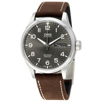 Stainless steel case with a brown leather strap. Fixed stainless steel bezel. Grey dial with luminous silver-tone hands and Arabic numeral hour markers. Minute markers around the outer rim. Dial Type: Analog. Luminescent hands and markers. Day of the week and date display at the 3 o'clock position. Oris calibre 752, base SW 220-1 automatic movement, based upon SW 220-1, containing 26 Jewels, bitting at 28800 vph, and has a power reserve of approximately 38 hours. Scratch resistant sapphire crystal. Screw down crown. Transparent case back. Round case shape. Case size: 45 mm. Case thickness: 12.5 mm. Band width: 21 mm, band length: 8 inches. Deployment with push button release clasp. Water resistant at 100 meters / 330 feet. Functions: date, day, hour, minute, second. Big Crown Pro Pilot Series. Pilot watch style. Watch label: Swiss Made. Oris Big Crown Pro Pilot Automatic Grey Dial Men's Watch 752-7698-4063BRLS. GENERAL Box Type: Original Box CASE Case Size: 45 Case Thickness: 12.5 mm Case Material: Stainless Steel Case Shape: Round Case Back: Transparent BAND Band Material: Leather Band Type: Strap Band Color: Brown Band Length: 8 inches Band Width: 21 mm Clasp: Deployment with Push Button Release DIAL Dial Color: Grey Type: Analog Crystal: Scratch Resistant Sapphire Hands: Luminous Silver-tone Dial Markers: Arabic Numeral Second Markers: Minute Markers around the outer rim Luminiscence: Hands and Markers Bezel: Fixed Bezel Color: Silver-tone Bezel Material: Stainless Steel Crown: Screw Down INFORMATION Brand: Oris Series: Big Crown Pro Pilot Collection Name: Big Crown Pro Pilot Gender: Mens Model: 01-752-7698-4063-07-5-22-05fc Watch Label: Swiss Made Movement: Automatic Engine: Oris Calibre 752, base SW 220-1 Power Reserve: 38 hours FEATURES Water Resistance: 100 meters / 330 feet Calendar: Day of the Week and Date display at the 3 o'clock position Functions: Date, Day, Hour, Minute, Second Watch Features: Analog, Leather, Stainless Steel ADDITIONAL INFO Watch Style: Pilot Warranty: 2 Year Jomashop Warranty UPC Code: 842047111819 Jomashop Sku: OR752-7698-4063BRLS Department: Watches Category: Watches