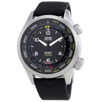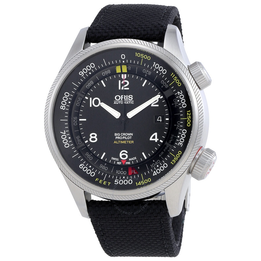 Silver-tone stainless steel case with a green fabric strap. Fixed silver-tone stainless steel bezel. Black dial with luminous silver-tone hands and Arabic numeral and index hour markers. Minute markers. altimeter and barometer markings. Dial Type: Analog. Luminescent hands and markers. Date display at the 3 o'clock position. Oris Calibre 733 Automatic movement, based upon Sellita SW200-1, containing 26 Jewels, bitting at 28800 vph, and has a power reserve of approximately 38 hours. Scratch resistant sapphire crystal. Screw down crown. Solid case back. Round case shape, case size: 47 mm, case thickness: 17.7 mm. Band width: 20 mm. Deployment clasp. Water resistant at 100 meters / 330 feet. Functions: date, hour, minute, second, altimeter, barometer. Big Crown Propilot Altimeter Series. Pilot watch style. Watch label: Swiss Made. Oris Big Crown ProPilot Automatic Black Dial Men's Watch 733-7705-4134FS. GENERAL Box Type: Original Box CASE Case Size: 47 Case Thickness: 17.7 mm Case Material: Stainless Steel Case Shape: Round Case Back: Solid BAND Band Material: Fabric Band Type: Strap Band Color: Green Band Width: 20 mm Clasp: Deployment DIAL Dial Color: Black Type: Analog Crystal: Scratch Resistant Sapphire Hands: Luminous Silver-tone Dial Markers: Arabic Numeral and Index Second Markers: Minute Markers. Altimeter and Barometer Markings Luminiscence: Hands and Markers Bezel: Fixed Bezel Color: Silver-tone Bezel Material: Stainless Steel Crown: Screw Down INFORMATION Brand: Oris Series: Big Crown Propilot Altimeter Collection Name: Big Crown ProPilot Altimeter Gender: Mens Model: 01 733 7705 4134-07 5 23 17FC Watch Label: Swiss Made Movement: Automatic Engine: Oris Calibre 733 Power Reserve: 38 hours FEATURES Water Resistance: 100 meters / 330 feet Calendar: Date display at the 3 o'clock position Functions: Date, Hour, Minute, Second, Altimeter, Barometer Watch Features: Analog, Stainless Steel, Altimeter ADDITIONAL INFO Watch Style: Pilot Warranty: 2 Year Jomashop Warranty Jomashop Sku: OR733-7705-4134FS Department: Watches Category: Watches