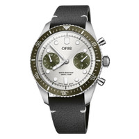 Silver-tone stainless steel case with a black leather strap. Ocean-green bezel. Grey dial with silver-tone hands and index hour markers. Minute markers around the outer rim. Dial Type: Analog. Luminescent hands and markers. Chronograph - two sub-dials displaying: 60 second and 30 minute. Oris Calibre 771, base SW 510 Automatic movement, containing 27 Jewels, bitting at 28800 vph, and has a power reserve of approximately 48 hours. Scratch resistant sapphire crystal. Solid case back. Round case shape, case size: 40 mm. Band width: 20 mm. Water resistant at 100 meters / 330 feet. Functions: chronograph, date, second time zone, hour, minute, small second. Divers Sixty-five Chronograph Series. Dive watch style. Watch label: Swiss Made. Oris Divers Sixty-Five Chronograph Automatic Grey Dial Men's Watch 01 771 7791 4051-07 6 20 01. GENERAL Box Type: Original Box CASE Case Diameter: 40 mm Case Material: Stainless Steel Case Shape: Round Case Back: Solid BAND Band Material: Leather Band Type: Strap Band Color: Black Band Width: 20 mm DIAL Dial Color: Grey Type: Analog Crystal: Scratch Resistant Sapphire Hands: Silver-tone Dial Markers: Index Second Markers: Minute Markers around the outer rim Sub Dials: Two - 60 Second and 30 Minute Luminiscence: Hands and Markers Bezel Color: Ocean-green INFORMATION Brand: Oris Series: Divers Sixty-Five Chronograph Collection Name: Divers Sixty-Five Chronograph Gender: Mens Model: 01 771 7791 4051-07 6 20 01 Watch Label: Swiss Made Movement: Automatic Engine: Oris Calibre 771, base SW 510 Power Reserve: 48 hours FEATURES Water Resistance: 100 meters / 330 feet Functions: Chronograph, Date, Second Time Zone, Hour, Minute, Small Second Watch Features: Analog, Leather, Stainless Steel, Chronograph, Time Zone ADDITIONAL INFO Watch Style: Dive Warranty: 2 Year Jomashop Warranty Jomashop Sku: Z-K2B3H Department: Watches