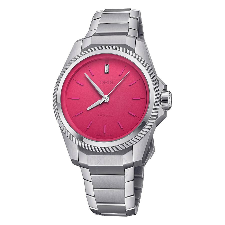 Silver-tone stainless steel case and bracelet. Fixed silver-tone stainless steel bezel. Pink dial with silver-tone hands and index hour markers. Baguette-cut lab-grown diamond at 12 o’clock position. Dial Type: Analog. Oris Calibre 53 automatic movement with a 42-hour power reserve. Scratch resistant sapphire crystal. Pull / push crown. Solid case back. Round case shape, case size: 34 mm. Band width: 17 mm. Deployment with push button release clasp. Water resistant at 100 meters / 330 feet. Functions: hour, minute, second. Propilot X Miss Piggy Edition Series. Dress watch style. Watch label: Swiss Made. Oris ProPilot X Miss Piggy Edition Automatic Pink Dial Watch 01 531 7796 4158-07 8 1705LC. GENERAL Box Type: Original Box CASE Case Material: Stainless Steel Case Shape: Round Case Back: Solid BAND Band Material: Stainless Steel Band Type: Bracelet Band Color: Silver-tone Band Width: 17 mm Clasp: Deployment with Push Button Release DIAL Dial Color: Pink Type: Analog Crystal: Scratch Resistant Sapphire Hands: Silver-tone Dial Markers: Index Second Markers: Baguette-cut lab-grown diamond at 12 o’clock position Bezel: Fixed Bezel Color: Silver-tone Bezel Material: Stainless Steel Crown: Pull / Push INFORMATION Brand: Oris Series: Propilot X Miss Piggy Edition Collection Name: ProPilot X Miss Piggy Edition Gender: Womens Model: 01 531 7796 4158-07 8 1705LC Watch Label: Swiss Made Movement: Automatic Engine: Oris Calibre 53 Power Reserve: 42 hours FEATURES Water Resistance: 100 meters / 330 feet Functions: Hour, Minute, Second Watch Features: Analog, Stainless Steel, Diamond ADDITIONAL INFO Watch Style: Dress Warranty: 2 Year Jomashop Warranty Jomashop Sku: Z-DCASR Department: Watches