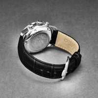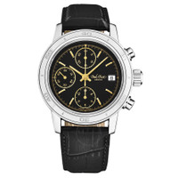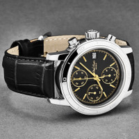 Silver-tone stainless steel case with a black leather strap. Fixed silver-tone stainless steel bezel. Black dial with gold-tone hands and index hour markers. Minute markers around the outer rim. Dial Type: Analog. Date display at the 3 o'clock position. Chronograph - three sub-dials displaying: 60 second, 30 minute and 12 hour. ETA-Valjoux Caliber 7750 Automatic movement, containing 25 Jewels, bitting at 28800 vph, and has a power reserve of approximately 44 hours. Scratch resistant sapphire crystal. Screw down crown. Solid case back. Round case shape, case size: 39 mm, case thickness: 14 mm. Band width: 19 mm, band length: 7.5 inches. Tang clasp. Water resistant at 100 meters / 330 feet. Functions: chronograph, date, day, hour, minute, second. Chronosport Series. Luxury watch style. Watch label: Swiss Made. Paul Picot Chronosport Chronograph Automatic Black Dial Men's Watch P7034.20.334. CASE Case Size: 39 Case Thickness: 14 mm Case Material: Stainless Steel Case Shape: Round Case Back: Solid BAND Band Material: Leather Band Type: Strap Band Color: Black Band Length: 7.5 inches Band Width: 19 mm Clasp: Tang DIAL Dial Color: Black Type: Analog Crystal: Scratch Resistant Sapphire Hands: Gold-tone Dial Markers: Index Second Markers: Minute Markers around the outer rim Sub Dials: Three - 60 Second, 30 Minute and 12 Hour Bezel: Fixed Bezel Color: Silver-tone Bezel Material: Stainless Steel Crown: Screw Down INFORMATION Brand: Paul Picot Series: Chronosport Collection Name: Chronosport Gender: Mens Model: P7034.20.334 Watch Label: Swiss Made Movement: Automatic Engine: ETA-Valjoux Caliber 7750 Power Reserve: 44 hours FEATURES Water Resistance: 100 meters / 330 feet Calendar: Date Display at the 3 o'clock position Functions: Chronograph, Date, Day, Hour, Minute, Second Watch Features: Analog, Gold, Leather, Stainless Steel, Chronograph ADDITIONAL INFO Watch Style: Luxury Warranty: 2 Year Jomashop Warranty Jomashop Sku: Y-A3UDZ Department: Watches Category: Watches
