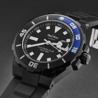 Black stainless steel case with a black rubber strap. Uni-directional rotating black stainless steel bezel. Black dial with silver-tone hands and index hour markers. Minute markers around the outer rim. Dial Type: Analog. Luminescent hands and markers. Date display at the 3 o'clock position. Calibre PP 1700 automatic movement. Scratch resistant sapphire crystal. Solid case back. Round case shape, case size: 43 mm, case thickness: 12.7 mm. Band width: 24 mm, band length: 8 inches. Tang clasp. Water resistant at 200 meters / 660 feet. Functions: date, hour, minute, second. Additional Info: hours, minutes, seconds, date. Yachtmanclub Series. Luxury watch style. Watch label: Swiss Made. Paul Picot Yachtmanclub Automatic Black Dial Men's Watch P1251N.NB.3614CM001. CASE Case Size: 43 Case Thickness: 12.7 mm Case Material: Stainless Steel Case Shape: Round Case Back: Solid BAND Band Material: Rubber Band Type: Strap Band Color: Black Band Length: 8 inches Band Width: 24 mm Clasp: Tang DIAL Dial Color: Black Type: Analog Crystal: Scratch Resistant Sapphire Hands: Silver-tone Dial Markers: Index Second Markers: Minute Markers around the outer rim Luminiscence: Hands and Markers Bezel: Uni-directional Rotating Bezel Color: Black Bezel Material: Stainless Steel INFORMATION Brand: Paul Picot Series: Yachtmanclub Collection Name: Yachtmanclub Gender: Mens Model: P1251N.NB.3614CM001 Watch Label: Swiss Made Movement: Automatic Engine: Calibre PP 1700 FEATURES Water Resistance: 200 meters / 660 feet Calendar: Date Display at the 3 o'clock position Functions: Date, Hour, Minute, Second Watch Features: Stainless Steel, Rubber, Analog ADDITIONAL INFO Watch Style: Luxury Warranty: 2 Year Jomashop Warranty Additional Info: Hours, minutes, seconds, date Jomashop Sku: Y-A4FZD Department: Watches