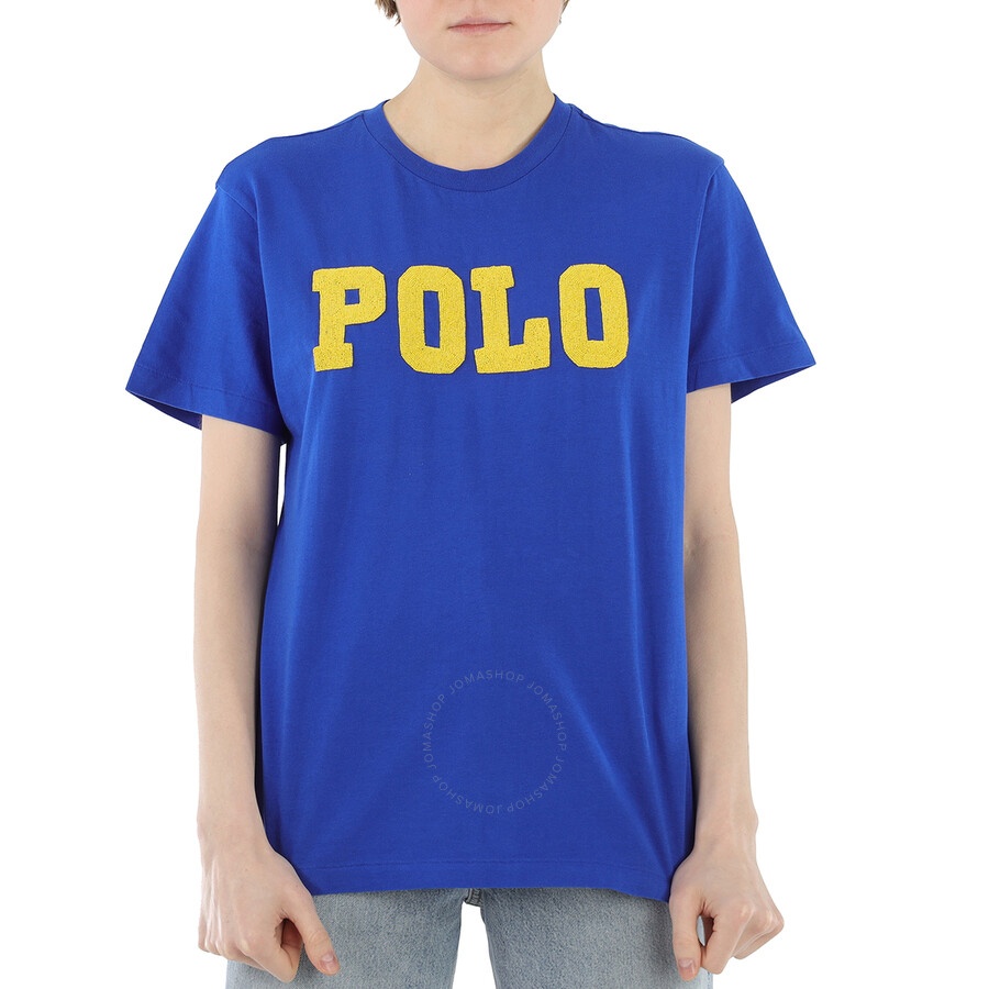 Polo Ralph Lauren Ladies Tops. Fashion category: T-Shirts & Henleys. SKU: 211763498002. Color: Blue. Polo Ralph Lauren Embellished Logo Short-sleeve Cotton T-shirt. This cotton t-shirt features a beaded Polo Ralph Lauren signature branding on the front, short sleeves, a crewneck, a straight hem, and a relaxed-fit. Material: 100% Cotton. GENERAL Color: Blue INFORMATION Brand: Polo Ralph Lauren Gender: Womens Model: 211763498002 DETAILS Category: Tops Apparel Type: Graphic Tees Material: Cotton ADDITIONAL INFO Jomashop Sku: -211763498002N Department: Apparel