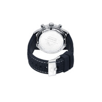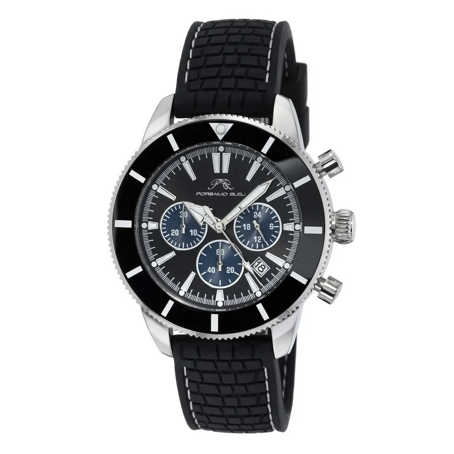 Silver-tone stainless steel case with a black silicone strap. Uni-directional rotating black stainless steel bezel. Black dial with silver-tone hands and index hour markers. Minute markers around the outer rim. Dial Type: Analog. Luminescent hands and markers. Date display between 4 and 5 o'clock position. Chronograph - three sub-dials displaying: 60 second, 30 minute and 24 hour. Miyota Caliber JS25 quartz movement. Scratch resistant mineral crystal. Pull / push crown. Solid case back. Round case shape, case size: 44 mm, case thickness: 12 mm. Band width: 20 mm, band length: 8 inches. Buckle clasp. Water resistant at 50 meters / 165 feet. Functions: chronograph, date, hour, minute, second. Additional Info: chronograph. Brandon Series. Luxury watch style. Watch label: Japan Movt. Porsamo Bleu Brandon Chronograph Quartz Black Dial Men's Watch 1013ABRR. GENERAL Box Type: Original Box CASE Case Diameter: 44 mm Case Thickness: 12 mm Case Material: Stainless Steel Case Shape: Round Case Back: Solid BAND Band Material: Silicone Band Type: Strap Band Color: Black Band Length: 8 inches Band Width: 20 mm Clasp: Buckle DIAL Dial Color: Black Type: Analog Crystal: Scratch Resistant Mineral Hands: Silver-tone Dial Markers: Index Second Markers: Minute Markers around the outer rim Sub Dials: Three - 60 Second, 30 Minute and 24 Hour Luminiscence: Hands and Markers Bezel: Uni-directional Rotating Bezel Color: Black Bezel Material: Stainless Steel Crown: Pull / Push INFORMATION Brand: Porsamo Bleu Series: Brandon Collection Name: Brandon Gender: Mens Model: 1013ABRR Watch Label: Japan Movt Movement: Quartz Engine: Miyota Caliber JS25 FEATURES Water Resistance: 50 meters / 165 feet Calendar: Date display between 4 and 5 o'clock position Functions: Chronograph, Date, Hour, Minute, Second Watch Features: Analog, Stainless Steel, Chronograph ADDITIONAL INFO Watch Style: Luxury Warranty: With Extended 7 Year Manufacturers Guarantee UPC Code: 819179027615 Additional Info: Manufacturer's limited warranty - now extended to 7 years! Chronograph Jomashop Sku: Y-A3HBY Department: Watches Category: Watches