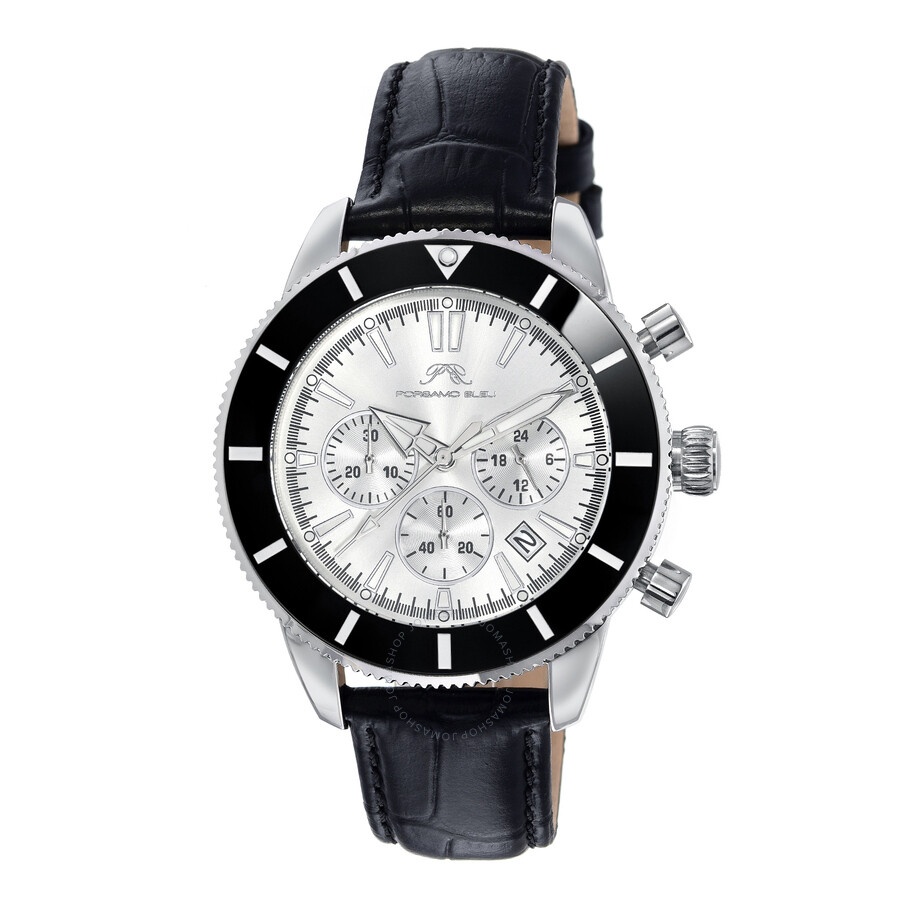 Silver-tone stainless steel case with a black leather strap. Uni-directional rotating black stainless steel bezel. Silver-tone dial with silver-tone hands and index hour markers. Minute markers around the outer rim. Dial Type: Analog. Luminescent hands and markers. Date display between 4 and 5 o'clock position. Chronograph - three sub-dials displaying: 60 second, 30 minute and 24 hour. Miyota Caliber JS25 quartz movement. Scratch resistant mineral crystal. Pull / push crown. Solid case back. Round case shape, case size: 44 mm, case thickness: 12 mm. Band width: 20 mm, band length: 8 inches. Buckle clasp. Water resistant at 50 meters / 165 feet. Functions: chronograph, date, hour, minute, second. Additional Info: chronograph. Brandon Series. Luxury watch style. Watch label: Japan Movt. Porsamo Bleu Brandon Chronograph Quartz Silver Dial Men's Watch 1012BBRL. CASE Case Size: 44 Case Thickness: 12 mm Case Material: Stainless Steel Case Shape: Round Case Back: Solid BAND Band Material: Leather Band Type: Strap Band Color: Black Band Length: 8 inches Band Width: 20 mm Clasp: Buckle DIAL Dial Color: Silver-tone Type: Analog Crystal: Scratch Resistant Mineral Hands: Silver-tone Dial Markers: Index Second Markers: Minute Markers around the outer rim Sub Dials: Three - 60 Second, 30 Minute and 24 Hour Luminiscence: Hands and Markers Bezel: Uni-directional Rotating Bezel Color: Black Bezel Material: Stainless Steel Crown: Pull / Push INFORMATION Brand: Porsamo Bleu Series: Brandon Collection Name: Brandon Gender: Mens Model: 1012BBRL Watch Label: Japan Movt Movement: Quartz Engine: Miyota Caliber JS25 FEATURES Water Resistance: 50 meters / 165 feet Calendar: Date display between 4 and 5 o'clock position Functions: Chronograph, Date, Hour, Minute, Second Watch Features: Analog, Leather, Stainless Steel, Chronograph ADDITIONAL INFO Watch Style: Luxury Warranty: With Manufacturers Guarantee UPC Code: 819179027592 Additional Info: Chronograph Jomashop Sku: Y-A3HBU Department: Watches Category: Watches
