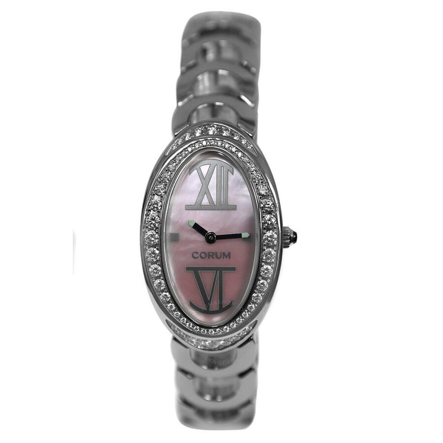 Silver-tone stainless steel case and bracelet. Fixed silver-tone bezel with diamond set stainless steel. Pink dial with silver-tone hands and Roman numeral & index hour markers. Dial Type: Analog. Quartz movement. Scratch resistant sapphire crystal. Pull / push crown. Solid case back. Oval case shape, case size: 24 mm. Fold over clasp with a safety release. Functions: hour, minute. Oval Series. Luxury watch style. Watch label: Swiss Made. Pre-owned Corum Oval Quartz Diamond Pink Dial Ladies Watch 137.410.47. GENERAL Collection Name: Oval INFORMATION Brand: Corum Series: Oval Model: 137.410.47 Gender: Womens Watch Label: Swiss Made Movement: Quartz CONDITION INFORMATION Box: No Preowned Item Condition: Excellent Papers: No Comments: The watch is in near to mint condition with no visible scratches to the naked eye but may have some tiny scratches under close-up inspection. The only exception is the small scratches on the back case. Fits the lady's wrist up to 5 inches, a very small size, please be sure that it will fit your wrist. A new battery was installed and quartz movement keeps perfect time. The watch passed the water pressure test and we will include the printout of the test results. The serial numbers are present on CASE Case Size: 24 mm Case Material: Stainless Steel Case Shape: Oval Case Back: Solid DIAL Type: Analog Dial Color: Pink Crystal: Scratch Resistant Sapphire Hands: Silver-tone Dial Markers: Roman Numeral & Index Bezel: Fixed Bezel Color: Silver-tone Bezel Material: Diamond Set Stainless Steel Crown: Pull / Push BAND Band Type: Bracelet Band Material: Stainless Steel Band Color: Silver-tone Clasp: Fold Over with Safety Release FEATURES Functions: Hour, Minute Watch Features: Diamond, Stainless Steel, Analog ADDITIONAL INFO Watch Style: Luxury Warranty: 1 Year Jomashop Warranty Jomashop Sku: PRE-P-CM71517 Department: Watches Category: Watches