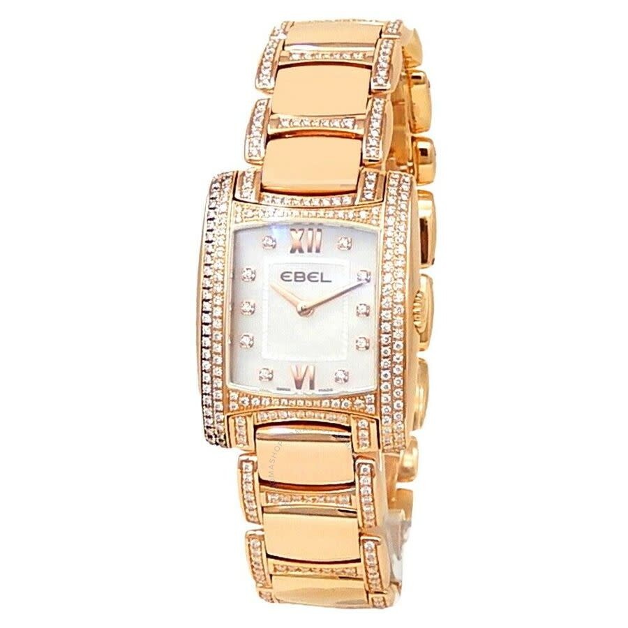 Rose gold-tone 18kt rose gold case and bracelet. Fixed rose gold-tone bezel with diamond set 18kt rose gold. Mother of pearl dial with rose gold-tone hands and diamond hour markers. Dial Type: Analog. Quartz movement. Scratch resistant sapphire crystal. Solid case back. Rectangle case shape, case size: 28 mm. Hidden clasp. Water resistant at 50 meters / 165 feet. Functions: hour, minute. Brasilia Lady Joaillerie Series. Dress watch style. Pre-owned Ebel Brasilia Lady Joaillerie Quartz Diamond Ladies Watch 1290088. GENERAL Collection Name: Brasilia Lady Joaillerie INFORMATION Brand: Ebel Series: Brasilia Lady Joaillerie Model: 1290088 Gender: Womens Movement: Quartz CONDITION INFORMATION Box: No Preowned Item Condition: Very Good Papers: No CASE Case Size: 28 mm Case Material: 18kt Rose Gold Case Shape: Rectangle Case Back: Solid DIAL Type: Analog Dial Color: Mother of Pearl Crystal: Scratch Resistant Sapphire Hands: Rose Gold-tone Dial Markers: Diamond Bezel: Fixed Bezel Color: Rose Gold-tone Bezel Material: Diamond Set 18kt Rose Gold BAND Band Type: Bracelet Band Material: 18kt Rose Gold Band Color: Rose Gold-tone Clasp: Hidden FEATURES Water Resistance: 50 meters / 165 feet Functions: Hour, Minute Watch Features: Diamond, Gold, Analog ADDITIONAL INFO Watch Style: Dress Warranty: 1 Year Jomashop Warranty Jomashop Sku: PRE-P-EB46974 Department: Watches Category: Watches