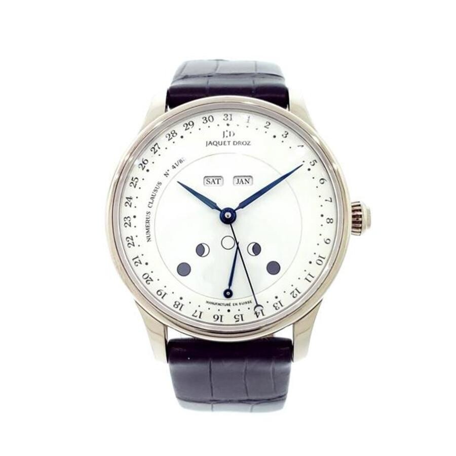 18kt white gold case with a black alligator band. Fixed white 18kt white gold bezel. White dial with blue hands and index hour markers. Date display and minute markers around the outer rim. Dial Type: Analog. Day and month at the 12 o'clock position. Moon phase subdials. Jaquet Droz Calibre 6553.4 automatic movement with a 72-hour power reserve. Scratch resistant sapphire crystal. Pull / push crown. Transparent case back. Round case shape, case size: 40.5 mm, case thickness: 12 mm. Band width: 22 mm. Buckle clasp. Water resistant at 30 meters / 100 feet. Functions: calendar, date, day, month, moon-phase, water resistant. Luxury watch style. Watch label: Swiss Made. Pre-owned Jaquet Droz Les Lunes Hommage Geneve 1784 Automatic White Dial Men's Watch J0126. Box: No ,Paper: Yes GENERAL Collection Name: Les Lunes Hommage Geneve 1784 INFORMATION Brand: Jaquet Droz Series: Les Lunes Hommage Geneve 1784 Model: J0126 Gender: Mens Watch Label: Swiss Made Movement: Automatic Engine: Jaquet Droz Calibre 6553.4 Power Reserve: 72 hours CONDITION INFORMATION Box: No Preowned Item Condition: Excellent Papers: Yes Year: 2005 Comments: Jaquet Droz 18k White Gold 40.5mm Les Lunes Hommage Geneve 1784 Ref J0126 Limited to 88 Pieces CASE Case Size: 40.5 mm Case Thickness: 12 mm Case Color: White Case Material: 18kt White Gold Case Shape: Round Case Back: Transparent DIAL Type: Analog Dial Color: White Crystal: Scratch Resistant Sapphire Hands: Blue Second Markers: Date Display and Minute Markers around the outer rim Dial Markers: Index Sub Dials: One - Moonphase Bezel: Fixed Bezel Color: White Bezel Material: 18kt White Gold Crown: Pull / Push BAND Band Type: Strap Band Material: Alligator Band Color: Black Band Width: 22 mm Clasp: Buckle FEATURES Water Resistance: 30 meters / 100 feet Calendar: Day and Month at the 12 o'clock position Functions: Calendar, Date, Day, Month, Moon-phase, Water resistant Watch Features: Alligator Leather, Analog, Month, Gold, Moon Phase ADDITIONAL INFO Watch Style: Luxury Warranty: 1 Year Jomashop Warranty Jomashop Sku: PRE-P-JDR-31506 Department: Watches Category: Watches