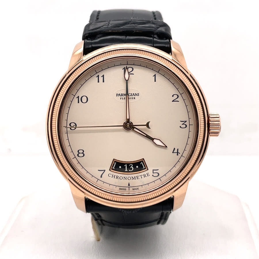 Rose gold-tone 18kt rose gold case with a black leather strap. Fixed rose gold-tone 18kt rose gold bezel. Beige dial with rose gold-tone hands and Arabic numeral hour markers. Minute markers around the outer rim. Dial Type: Analog. Luminescent hands. Date display at the 6 o'clock position. Automatic movement. Scratch resistant sapphire crystal. Pull / push crown. Transparent case back. Round case shape, case size: 40 mm, case thickness: 9 mm. Band width: 20 mm. Buckle clasp. Water resistant at 30 meters / 100 feet. Functions: date, hour, minute, second. Toric Series. Luxury watch style. Watch label: Swiss Made. Pre-owned Parmigiani Fleurier Toric Automatic Men's Watch PFC423-1602400-HA1441. GENERAL Collection Name: Toric INFORMATION Brand: Parmigiani Fleurier Series: Toric Model: PFC423-1602400-HA1441 Gender: Mens Watch Label: Swiss Made Movement: Automatic CONDITION INFORMATION Box: No Preowned Item Condition: Excellent Papers: No CASE Case Size: 40 mm Case Thickness: 9 mm Case Material: 18kt Rose Gold Case Shape: Round Case Back: Transparent DIAL Type: Analog Dial Color: Beige Crystal: Scratch Resistant Sapphire Hands: Rose Gold-tone Second Markers: Minute Markers around the outer rim Dial Markers: Arabic Numeral Luminiscence: Hands Bezel: Fixed Bezel Color: Rose Gold-tone Bezel Material: 18kt Rose Gold Crown: Pull / Push BAND Band Type: Strap Band Material: Leather Band Color: Black Band Width: 20 mm Clasp: Buckle FEATURES Water Resistance: 30 meters / 100 feet Calendar: Date display at the 6 o'clock position Functions: Date, Hour, Minute, Second Watch Features: Leather, Gold, Analog ADDITIONAL INFO Watch Style: Luxury Warranty: 1 Year Jomashop Warranty Jomashop Sku: PRE-P-PF55863 Department: Watches Category: Watches