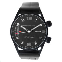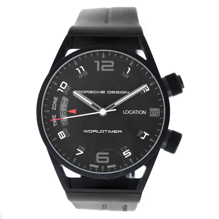 Black titanium case with a black rubber strap. Fixed black titanium bezel. Black dial with black hands and Arabic numeral hour markers. Minute markers around the outer rim. Dial Type: Analog. Luminescent hands and markers. Automatic movement. Scratch resistant sapphire crystal. Screw down crown. Solid case back. Round case shape, case size: 45 mm, case thickness: 17 mm. Deployment with push button release clasp. Water resistant at 100 meters / 330 feet. Functions: hour, minute, second. Worldtimer P6750 Series. Casual watch style. Watch label: Swiss Made. Pre-owned Porsche Design Worldtimer P6750 Automatic Black Dial Men's Watch 6750.13.44.1180. GENERAL Collection Name: Worldtimer P6750 INFORMATION Brand: Porsche Design Series: Worldtimer P6750 Model: 6750.13.44.1180 Gender: Mens Watch Label: Swiss Made Movement: Automatic CONDITION INFORMATION Box: No Preowned Item Condition: Unworn / Like New Papers: Yes Comments: The first image is a stock photo to correctly show the dial details. No box. CASE Case Size: 45 mm Case Thickness: 17 mm Case Material: Titanium Case Shape: Round Case Back: Solid DIAL Type: Analog Dial Color: Black Crystal: Scratch Resistant Sapphire Hands: Black Second Markers: Minute Markers around the outer rim Dial Markers: Arabic Numeral Luminiscence: Hands and Markers Bezel: Fixed Bezel Color: Black Bezel Material: Titanium Crown: Screw Down BAND Band Type: Strap Band Material: Rubber Band Color: Black Clasp: Deployment with Push Button Release FEATURES Water Resistance: 100 meters / 330 feet Functions: Hour, Minute, Second Watch Features: Titanium, Rubber, Analog ADDITIONAL INFO Watch Style: Casual Warranty: 1 Year Jomashop Warranty Jomashop Sku: PRE-P-52335 Department: Watches Category: Watches