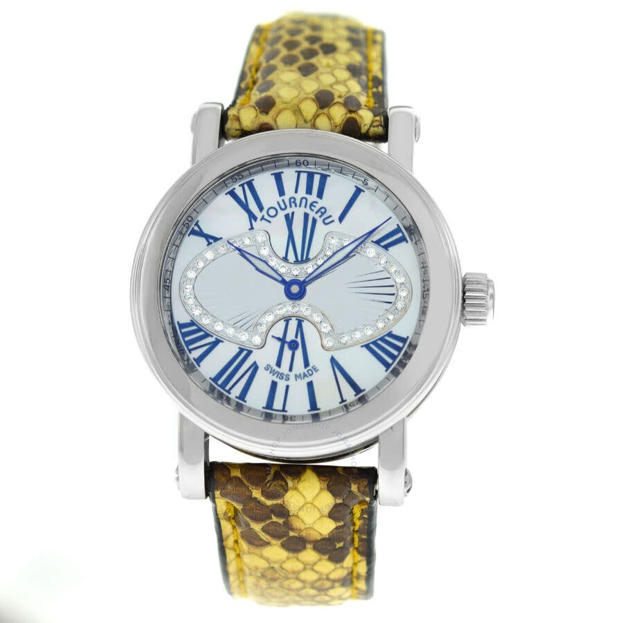 Silver-tone stainless steel case with a sharkskin band. Fixed silver-tone stainless steel bezel. Mother of pearl dial with blue hands and Roman numeral hour markers. Dial Type: Analog. Automatic movement. Transparent see through case back. Round case shape, case size: 35 mm. Band length: 7.5 inches. Fold over clasp with a safety release. Functions: hour, minute, second. Gotham Metro Series. Luxury watch style. Watch label: Swiss Made. Pre-owned Tourneau Gotham Metro Automatic Ladies Watch 00124830293555. GENERAL Collection Name: Gotham Metro INFORMATION Brand: Tourneau Series: Gotham Metro Model: 00124830293555 Gender: Womens Watch Label: Swiss Made Movement: Automatic CONDITION INFORMATION Box: Yes Preowned Item Condition: Excellent Papers: No Comments: Store display model in excellent condition with light dents on the side of the case. The python leather has some bending and wears on the inside due to being in the store display. The watch comes with a box but no paper. The retail price for this watch is $3,350. Fits the lady's wrist up to 7.5 inches. Authenticity is 100% guaranteed. CASE Case Size: 35 mm Case Material: Stainless Steel Case Shape: Round Case Back: Transparent See Through DIAL Type: Analog Dial Color: Mother of Pearl Hands: Blue Dial Markers: Roman Numeral Bezel: Fixed Bezel Color: Silver-tone Bezel Material: Stainless Steel BAND Band Material: Sharkskin Band Length: 7.5 inches Clasp: Fold Over with Safety Release FEATURES Functions: Hour, Minute, Second Watch Features: Stainless Steel, Analog ADDITIONAL INFO Watch Style: Luxury Warranty: 1 Year Jomashop Warranty Jomashop Sku: PRE-P-80799 Department: Watches