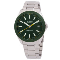 Silver-tone stainless steel case and bracelet. Fixed green ceramic bezel. Green sunray dial with silver-tone hands and index hour markers. Minute markers around the outer rim. Dial Type: Analog. Luminescent hands and markers. Date display at the 3 o'clock position. Rado Calibre 292 quartz movement. Scratch resistant sapphire crystal. Solid case back. Round case shape, case size: 41.5 mm, case thickness: 11.7 mm. Fold over clasp with a safety release. Water resistant at 150 meters / 500 feet. Functions: date, hour, minute, second. Hyperchrome Series. Casual watch style. Watch label: Swiss Made. Rado HyperChrome Quartz Green Dial Men's Watch R32280313. GENERAL Box Type: Original Box CASE Case Thickness: 11.7 mm Case Material: Stainless Steel Case Shape: Round Case Back: Solid BAND Band Material: Stainless Steel Band Type: Bracelet Band Color: Silver-tone Clasp: Fold Over with Safety Release DIAL Dial Color: Green Sunray Type: Analog Crystal: Scratch Resistant Sapphire Hands: Silver-tone Dial Markers: Index Second Markers: Minute Markers around the outer rim Luminiscence: Hands and Markers Bezel: Fixed Bezel Color: Green Bezel Material: Ceramic INFORMATION Brand: Rado Series: Hyperchrome Collection Name: HyperChrome Gender: Mens Model: R32280313 Watch Label: Swiss Made Movement: Quartz Engine: Rado Calibre 292 FEATURES Water Resistance: 150 meters / 500 feet Calendar: Date display at the 3 o'clock position Functions: Date, Hour, Minute, Second Watch Features: Analog, Ceramic, Stainless Steel ADDITIONAL INFO Watch Style: Casual Warranty: 2 Year Jomashop Warranty UPC Code: 7612819066028 Jomashop Sku: RADO-R32280313 Department: Watches