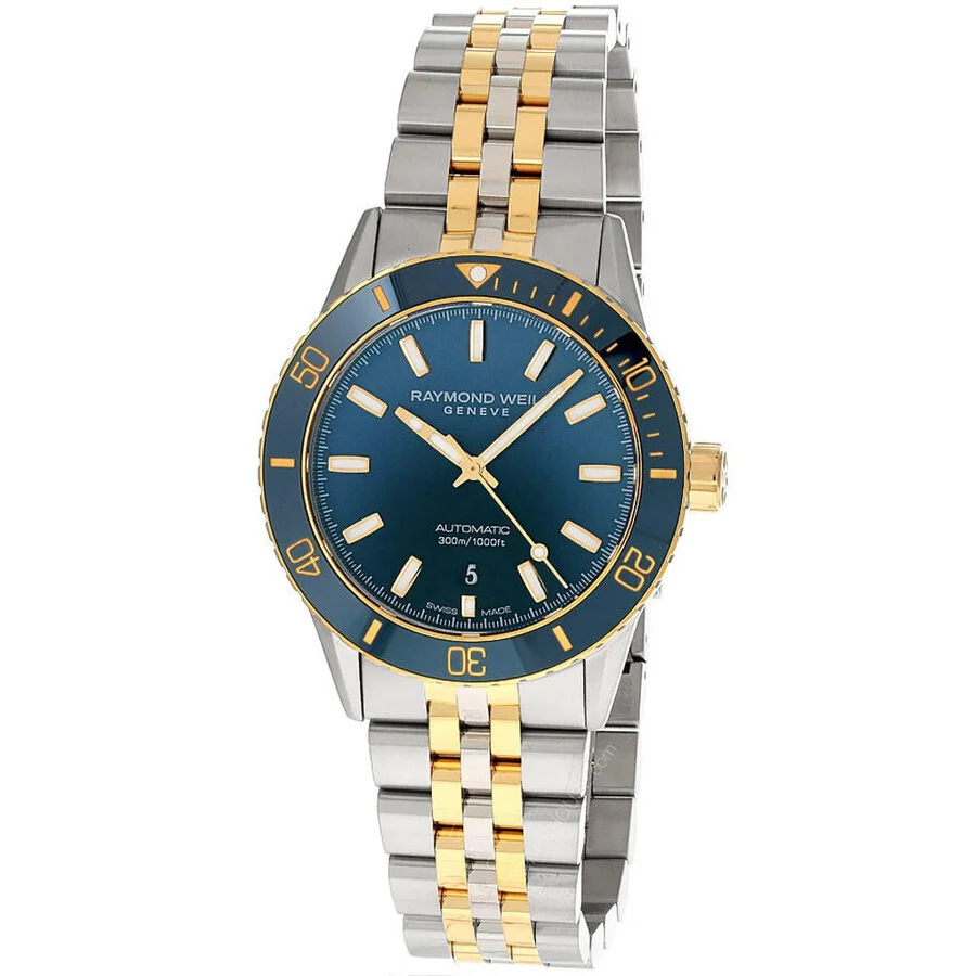 Silver-tone stainless steel with rose gold PVD plating case with a two-tone (silver-tone and rose gold-tone) stainless steel with rose gold PVD plating bracelet. Uni-directional rotating black ceramic bezel. Blue dial with rose gold-tone hands and index hour markers. Minute markers around the outer rim. Dial Type: Analog. Luminescent hands and markers. Date display at the 6 o'clock position. Automatic movement with a 38-hour power reserve. Scratch resistant sapphire crystal. Screw down crown. Solid case back. Round case shape, case size: 42.5 mm, case thickness: 11.7 mm. Band width: 21 mm. Fold over clasp with a safety release. Water resistant at 300 meters / 1000 feet. Functions: date, hour, minute, second. Dive watch style. Watch label: Swiss Made. Raymond Weil Automatic Blue Dial Men's Watch 2775-SP3-50051. GENERAL Box Type: Original Box CASE Case Diameter: 42 mm Case Thickness: 11.7 mm Case Material: Stainless steel with rose gold PVD plating Case Shape: Round Case Back: Solid BAND Band Material: Stainless steel with rose gold PVD plating Band Type: Bracelet Band Color: Two-tone (Silver-tone and Rose Gold-tone) Band Width: 21 mm Clasp: Fold Over with Safety Release DIAL Dial Color: Blue Type: Analog Crystal: Scratch Resistant Sapphire Hands: Rose Gold-tone Dial Markers: Index Second Markers: Minute Markers around the outer rim Luminiscence: Hands and Markers Bezel: Uni-directional Rotating Bezel Color: Black Bezel Material: Ceramic Crown: Screw Down INFORMATION Brand: Raymond Weil Gender: Mens Model: 2775-SP3-50051 Watch Label: Swiss Made Movement: Automatic Power Reserve: 38 hours FEATURES Water Resistance: 300 meters / 1000 feet Calendar: Date display at the 6 o'clock position Functions: Date, Hour, Minute, Second Watch Features: Analog, Ceramic, Gold, Stainless Steel ADDITIONAL INFO Watch Style: Dive Warranty: 2 Year Jomashop Warranty Jomashop Sku: RW2775-SP3-50051 Department: Watches Category: Watches