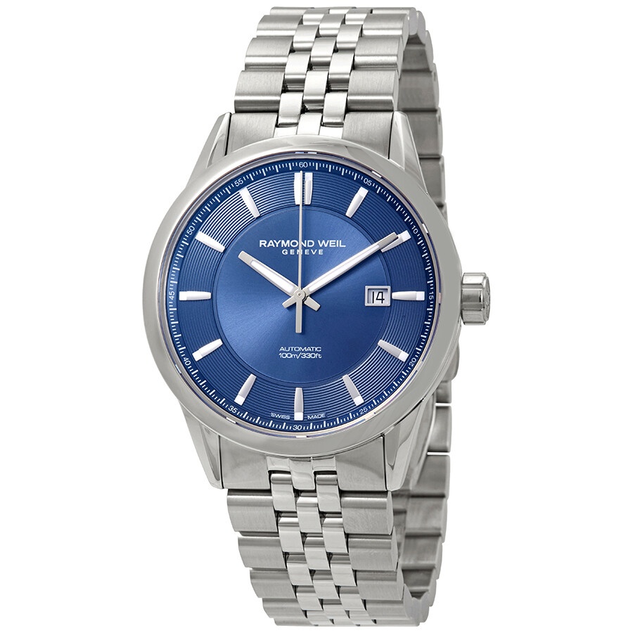 Stainless steel case with a stainless steel bracelet. Fixed stainless steel bezel. Blue dial with luminous silver-tone hands and index hour markers. Minute markers around the outer rim. Dial Type: Analog. Luminescent hands and markers. Date display at the 3 o'clock position. Sellita caliber SW 200 automatic movement, based upon ETA 2824-2, containing 26 Jewels, bitting at 28800 vph, and has a power reserve of approximately 38 hours. Scratch resistant sapphire crystal. Screw down crown. Transparent case back. Round case shape. Case size: 42 mm. Case thickness: 10.5 mm. Band width: 19 mm, band length: 8 inches. Deployment with push button release clasp. Water resistant at 100 meters / 330 feet. Functions: date, hour, minute, second. Freelancer Series. Dress watch style. Watch label: Swiss Made. Raymond Weil Freelancer Automatic Blue Dial Men's Watch 2731-ST-50001. INFORMATION Brand: Raymond Weil Series: Freelancer Collection Name: Freelancer Gender: Mens Model: 2731-ST-50001 Watch Label: Swiss Made Movement: Automatic Engine: Sellita Caliber SW 200 Power Reserve: 38 hours CASE Case Size: 42 mm Case Thickness: 10.5 mm Case Material: Stainless Steel Case Shape: Round Case Back: Transparent BAND Band Material: Stainless Steel Band Type: Bracelet Band Color: Silver-tone Band Length: 8 inches Band Width: 19 mm Clasp: Deployment with Push Button Release DIAL Dial Color: Blue Type: Analog Crystal: Scratch Resistant Sapphire Hands: Luminous Silver-tone Dial Markers: Index Second Markers: Minute Markers around the outer rim Luminiscence: Hands and Markers Bezel: Fixed Bezel Color: Silver-tone Bezel Material: Stainless Steel Crown: Screw Down FEATURES Water Resistance: 100 meters / 330 feet Calendar: Date display at the 3 o'clock position Functions: Date, Hour, Minute, Second Watch Features: Stainless Steel, Analog ADDITIONAL INFO Watch Style: Dress Warranty: 2 Year Jomashop Warranty UPC Code: 7611784043843 Jomashop Sku: RW-2731-ST-50001 Department: Watches Category: Watches