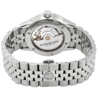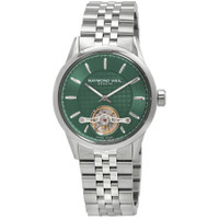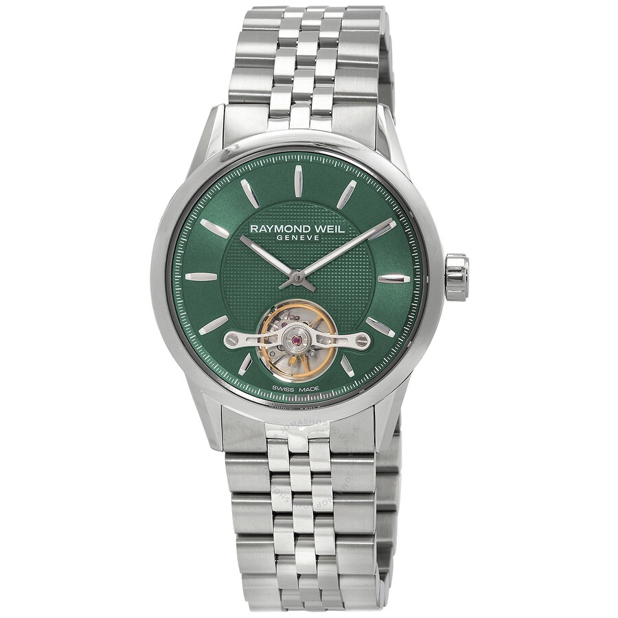 Stainless steel case with a stainless steel bracelet. Fixed stainless steel bezel. Green (visible balance wheel) dial with luminous silver-tone hands and index hour markers. Minute markers around the outer rim. Dial Type: Analog. Luminescent hands and markers. Raymond Weil calibre RW 1212 automatic movement, containing 27 Jewels, bitting at 28800 vph, and has a power reserve of approximately 38 hours. Scratch resistant sapphire crystal. Screw down crown. Transparent case back. Round case shape. Case size: 42.5 mm. Case thickness: 10.6 mm. Band width: 22 mm. Fold over clasp with a push button release. Water resistant at 100 meters / 330 feet. Functions: hour, minute, small second, balance wheel. Freelancer Series. Casual watch style. Watch label: Swiss Made. Raymond Weil Freelancer Automatic Green Dial Men's Watch 2780-ST-52001. GENERAL Box Type: Original Box CASE Case Size: 42 Case Thickness: 10.6 mm Case Material: Stainless Steel Case Shape: Round Case Back: Transparent BAND Band Material: Stainless Steel Band Type: Bracelet Band Color: Silver-tone Band Width: 22 mm Clasp: Fold Over with Push Button Release DIAL Dial Color: Green (Visible Balance Wheel) Type: Analog Crystal: Scratch Resistant Sapphire Hands: Luminous Silver-tone Dial Markers: Index Second Markers: Minute Markers around the outer rim Luminiscence: Hands and Markers Bezel: Fixed Bezel Color: Silver-tone Bezel Material: Stainless Steel Crown: Screw Down INFORMATION Brand: Raymond Weil Series: Freelancer Collection Name: Freelancer Gender: Mens Model: 2780-ST-52001 Watch Label: Swiss Made Movement: Automatic Engine: Raymond Weil Calibre RW 1212 Power Reserve: 38 hours FEATURES Water Resistance: 100 meters / 330 feet Functions: Hour, Minute, Small Second, balance Wheel Watch Features: Analog, Stainless Steel ADDITIONAL INFO Watch Style: Casual Warranty: 2 Year Jomashop Warranty UPC Code: 7611784047711 Jomashop Sku: RW-2780-ST-52001 Department: Watches Category: Watches