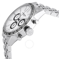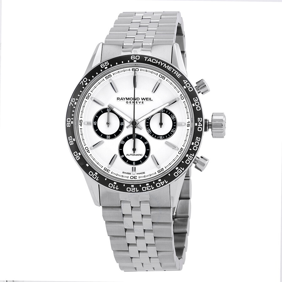 Silver-tone stainless steel case and bracelet. Black ceramic bezel. White dial with silver-tone hands and index hour markers. Minute markers around the outer rim. Dial Type: Analog. Chronograph - three sub-dials displaying: 60 second, 30 minute and 12 hour. Automatic movement. Scratch resistant sapphire crystal. Transparent see through case back. Round case shape, case size: 43.5 mm. Fold over clasp with a safety release. Water resistant at 100 meters / 330 feet. Functions: chronograph, hour, minute, second. Freelancer Series. Casual watch style. Watch label: Swiss Made. Raymond Weil Freelancer Chronograph Automatic White Dial Men's Watch 7741-ST1-30021. CASE Case Size: 43 Case Material: Stainless Steel Case Shape: Round Case Back: Transparent See Through BAND Band Material: Stainless Steel Band Type: Bracelet Band Color: Silver-tone Clasp: Fold Over with Safety Release DIAL Dial Color: White Type: Analog Crystal: Scratch Resistant Sapphire Hands: Silver-tone Dial Markers: Index Second Markers: Minute Markers around the outer rim Sub Dials: Three - 60 Second, 30 Minute and 12 Hour Bezel Color: Black Bezel Material: Ceramic INFORMATION Brand: Raymond Weil Series: Freelancer Collection Name: Freelancer Gender: Mens Model: 7741-ST1-30021 Watch Label: Swiss Made Movement: Automatic FEATURES Water Resistance: 100 meters / 330 feet Functions: Chronograph, Hour, Minute, Second Watch Features: Analog, Ceramic, Stainless Steel, Chronograph ADDITIONAL INFO Watch Style: Casual Warranty: 2 Year Jomashop Warranty UPC Code: 762115023496 Jomashop Sku: RW7741ST130021 Department: Watches Category: Watches