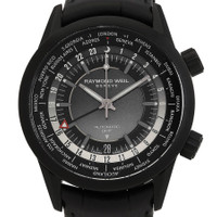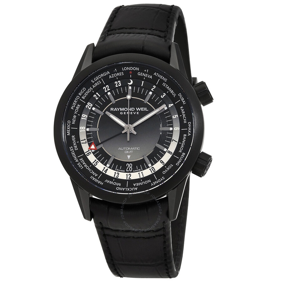 Black stainless steel case with a black leather strap. Fixed black stainless steel bezel. Black dial with black hands and Arabic numeral hour markers. Minute markers around the outer rim. Dial Type: Analog. Date display at the 6 o'clock position. Automatic movement. Scratch resistant sapphire crystal. Screw down crown. Transparent see through case back. Round case shape, case size: 40.5 mm. Deployment with push button release clasp. Water resistant at 100 meters / 330 feet. Functions: date, GMT, second time zone, hour, minute, second. Frelancer Series. Casual watch style. Watch label: Swiss Made. Raymond Weil Frelancer GMT Automatic Black Dial Men's Watch 2765-BKC-20001. CASE Case Size: 40 Case Material: Stainless Steel Case Shape: Round Case Back: Transparent See Through BAND Band Material: Leather Band Type: Strap Band Color: Black Clasp: Deployment with Push Button Release DIAL Dial Color: Black Type: Analog Crystal: Scratch Resistant Sapphire Hands: Black Dial Markers: Arabic Numeral Second Markers: Minute Markers around the outer rim Bezel: Fixed Bezel Color: Black Bezel Material: Stainless Steel Crown: Screw Down INFORMATION Brand: Raymond Weil Series: Frelancer Collection Name: Frelancer Gender: Mens Model: 2765-BKC-20001 Watch Label: Swiss Made Movement: Automatic FEATURES Water Resistance: 100 meters / 330 feet Calendar: Date display at the 6 o'clock position Functions: Date, GMT, Second Time Zone, Hour, Minute, Second Watch Features: Analog, GMT, Leather, Stainless Steel, Time Zone ADDITIONAL INFO Watch Style: Casual Warranty: 2 Year Jomashop Warranty Jomashop Sku: RW2765BKC20001 Department: Watches Category: Watches