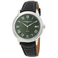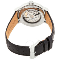 Silver-tone stainless steel case with a black leather strap. Fixed silver-tone stainless steel bezel. Gerem dial with silver-tone hands and Roman numeral hour markers. Minute markers around the outer rim. Dial Type: Analog. Date display at the 3 o'clock position. Automatic movement. Scratch resistant sapphire crystal. Pull / push crown. Transparent see through case back. Round case shape, case size: 39 mm, case thickness: 9.2 mm. Band width: 19 mm. Tang clasp. Water resistant at 50 meters / 165 feet. Functions: date, hour, minute, second. Maestro Series. Watch label: Swiss Made. Raymond Weil Maestro Automatic Men's Watch 2837-STC-00520. INFORMATION Brand: Raymond Weil Series: Maestro Collection Name: Maestro Gender: Mens Model: 2837-STC-00520 Watch Label: Swiss Made Movement: Automatic CASE Case Size: 39 mm Case Thickness: 9.2 mm Case Material: Stainless Steel Case Shape: Round Case Back: Transparent See Through BAND Band Material: Leather Band Type: Strap Band Color: Black Band Width: 19 mm Clasp: Tang DIAL Dial Color: Gerem Type: Analog Crystal: Scratch Resistant Sapphire Hands: Silver-tone Dial Markers: Roman Numeral Second Markers: Minute Markers around the outer rim Bezel: Fixed Bezel Color: Silver-tone Bezel Material: Stainless Steel Crown: Pull / Push FEATURES Water Resistance: 50 meters / 165 feet Calendar: Date display at the 3 o'clock position Functions: Date, Hour, Minute, Second Watch Features: Stainless Steel, Leather, Analog ADDITIONAL INFO Warranty: 2 Year Jomashop Warranty UPC Code: 7611784050537 Jomashop Sku: RW-2837-STC-00520 Department: Watches Category: Watches