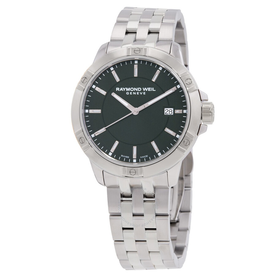 Silver-tone stainless steel case and bracelet. Fixed silver-tone stainless steel bezel. Green dial with silver-tone hands and index hour markers. Minute markers around the outer rim. Dial Type: Analog. Luminescent hands and markers. Date display at the 3 o'clock position. Quartz movement. Scratch resistant sapphire crystal. Screw down crown. Solid case back. Round case shape, case size: 41 mm. Fold over clasp with a safety release. Water resistant at 300 meters / 1000 feet. Functions: date, hour, minute, second. Raymon Weil Tango Series. Sport watch style. Watch label: Swiss Made. Raymond Weil Raymon Weil Tango Quartz Green Dial Men's Watch 8160-ST-52041. GENERAL Box Type: Original Box CASE Case Diameter: 41 mm Case Material: Stainless Steel Case Shape: Round Case Back: Solid BAND Band Material: Stainless Steel Band Type: Bracelet Band Color: Silver-tone Clasp: Fold Over with Safety Release DIAL Dial Color: Green Type: Analog Crystal: Scratch Resistant Sapphire Hands: Silver-tone Dial Markers: Index Second Markers: Minute Markers around the outer rim Luminiscence: Hands and Markers Bezel: Fixed Bezel Color: Silver-tone Bezel Material: Stainless Steel Crown: Screw Down INFORMATION Brand: Raymond Weil Series: Raymon Weil Tango Collection Name: Raymon Weil Tango Gender: Mens Model: 8160-ST-52041 Watch Label: Swiss Made Movement: Quartz FEATURES Water Resistance: 300 meters / 1000 feet Calendar: Date display at the 3 o'clock position Functions: Date, Hour, Minute, Second Watch Features: Stainless Steel, Analog ADDITIONAL INFO Watch Style: Sport Warranty: 2 Year Jomashop Warranty Jomashop Sku: RW8160ST52041 Department: Watches