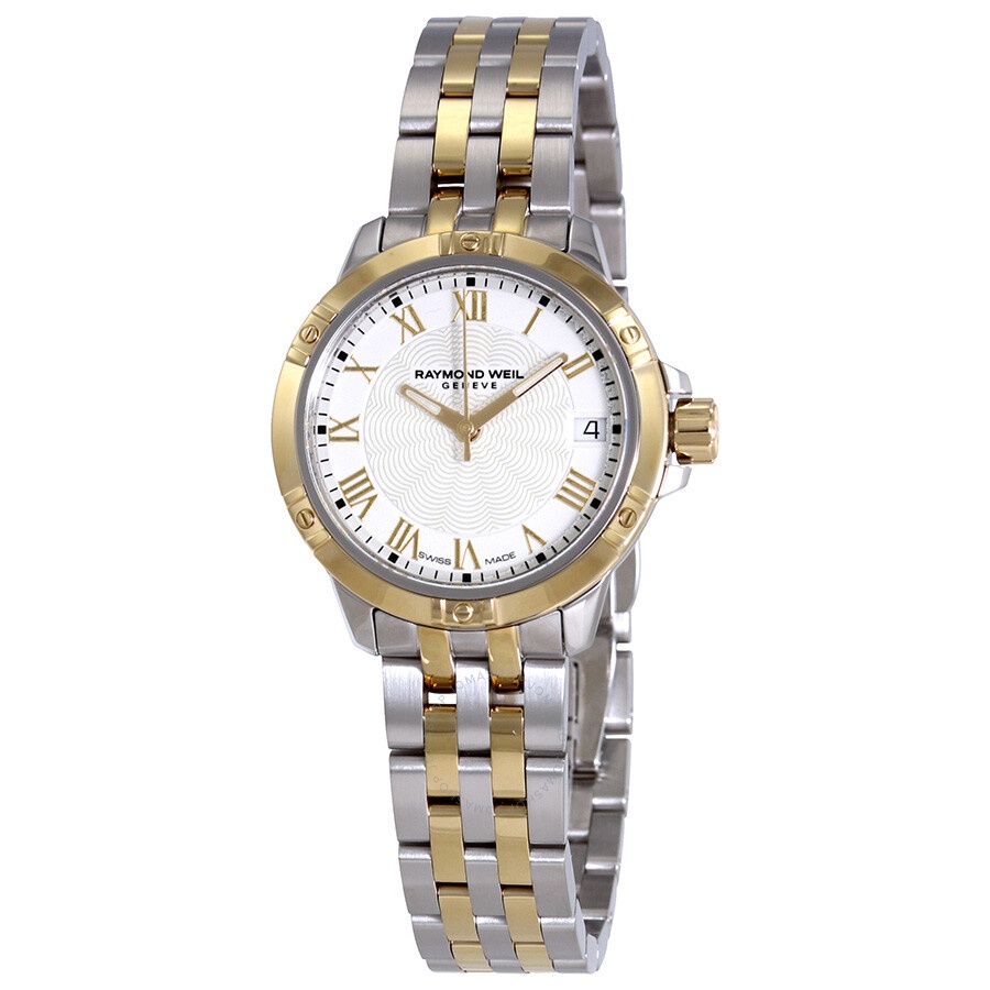 Stainless steel case with a two-tone (silver-tone and yellow gold PVD ) stainless steel bracelet. Fixed yellow gold-tone bezel. White dial with luminous yellow gold-tone hands and Roman numeral hour markers. Dial Type: Analog. Luminescent hands. Date display at the 3 o'clock position. Quartz movement. Scratch resistant sapphire crystal. Screw down crown. Solid case back. Round case shape. Case size: 30 mm. Case thickness: 7.32 mm. Bracelet width: 16 mm. Fold over clasp with a push button release. Water resistant at 100 meters / 330 feet. Functions: date, hour, minute, second. Dress watch style. Watch label: Swiss Made. Raymond Weil Tango Quartz White Dial Two-tone Ladies Watch 5960-STP-00308. INFORMATION Brand: Raymond Weil Series: Tango Collection Name: Tango Gender: Womens Model: 5960-STP-00308 Watch Label: Swiss Made Movement: Quartz CASE Case Size: 30 mm Case Thickness: 7.32 mm Case Material: Stainless Steel Case Shape: Round Case Back: Solid BAND Band Material: Stainless Steel Band Type: Bracelet Band Color: Two-tone (Silver-tone and Yellow Gold PVD ) Band Width: 16 mm Clasp: Fold Over with Push Button Release DIAL Dial Color: White Type: Analog Crystal: Scratch Resistant Sapphire Hands: Luminous Yellow Gold-tone Dial Markers: Roman Numeral Luminiscence: Hands Bezel: Fixed Bezel Color: Yellow Gold-tone Bezel Material: Stainless Steel Crown: Screw Down FEATURES Water Resistance: 100 meters / 330 feet Calendar: Date display at the 3 o'clock position Functions: Date, Hour, Minute, Second Watch Features: Stainless Steel, Gold, Analog ADDITIONAL INFO Watch Style: Dress Warranty: 2 Year Jomashop Warranty UPC Code: 7611784041320 Jomashop Sku: RW-5960-STP-00308 Department: Watches Category: Watches