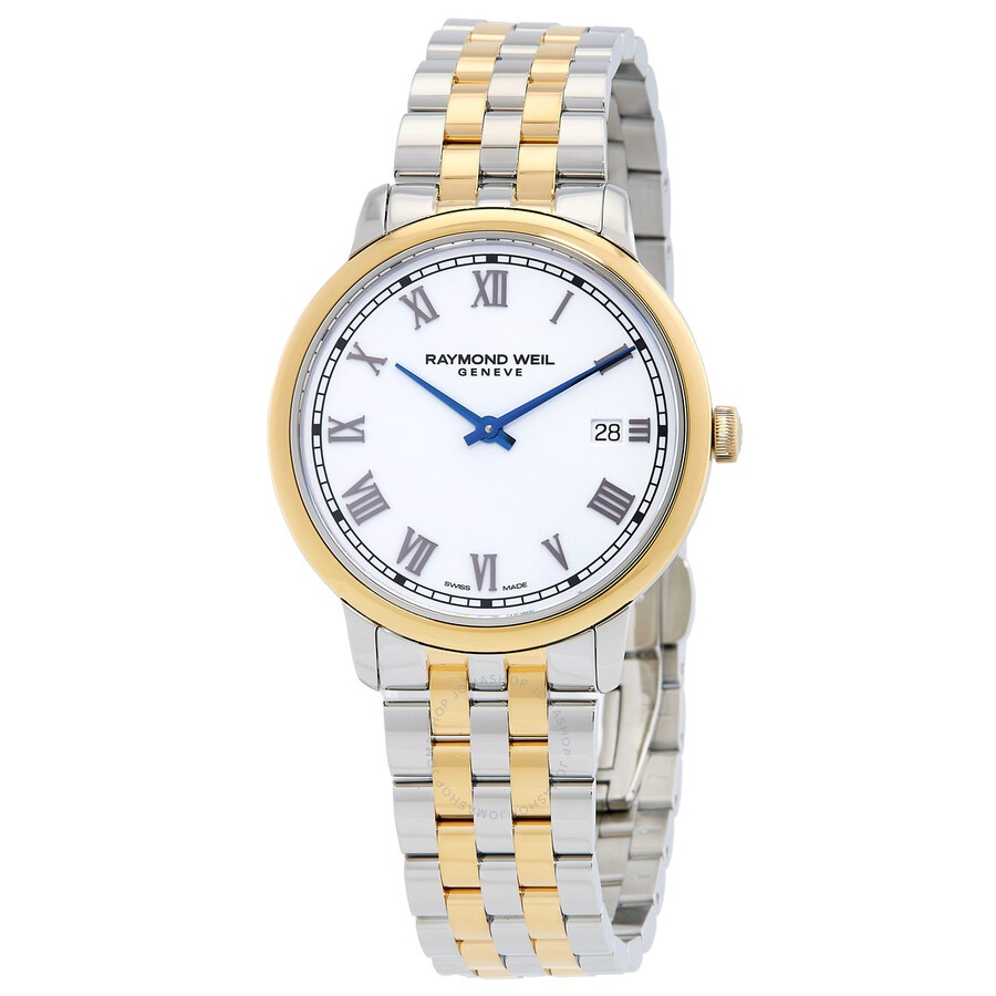 Silver-tone stainless steel case with a two-tone (silver-tone and yellow gold-tone) stainless steel bracelet. Fixed yellow gold-tone stainless steel bezel. White dial with blue hands and Roman numeral hour markers. Minute markers around the outer rim. Dial Type: Analog. Date display at the 3 o'clock position. Quartz movement. Round case shape, case size: 39 mm. Fold over clasp with a safety release. Functions: date, hour, minute, second. Toccata Series. Dress watch style. Watch label: Swiss Made. Raymond Weil Toccata Quartz White Dial Men's Watch 5485-STP-00359. CASE Case Size: 39 Case Material: Stainless Steel Case Shape: Round BAND Band Material: Stainless Steel Band Type: Bracelet Band Color: Two-tone (Silver-tone and Yellow Gold-tone) Clasp: Fold Over with Safety Release DIAL Dial Color: White Type: Analog Hands: Blue Dial Markers: Roman Numeral Second Markers: Minute Markers around the outer rim Bezel: Fixed Bezel Color: Yellow Gold-tone Bezel Material: Stainless Steel INFORMATION Brand: Raymond Weil Series: Toccata Collection Name: Toccata Gender: Mens Model: 5485-STP-00359 Watch Label: Swiss Made Movement: Quartz FEATURES Calendar: Date display at the 3 o'clock position Functions: Date, Hour, Minute, Second Watch Features: Analog, Gold, Stainless Steel ADDITIONAL INFO Watch Style: Dress Warranty: 2 Year Jomashop Warranty UPC Code: 762115024226 Jomashop Sku: RW5485STP00359 Department: Watches Category: Watches