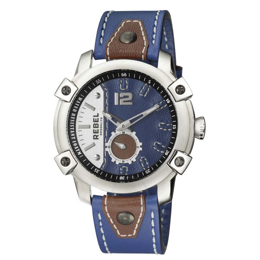 Silver-tone stainless steel case with a navy leather strap. Fixed silver-tone stainless steel bezel. Navy dial with silver-tone hands and index hour markers. Minute markers around the outer rim. Dial Type: Analog. Quartz movement. Scratch resistant mineral crystal. Push/pull crown. Solid case back. Round case shape, case size: 46 mm, case thickness: 11 mm. Band width: 22 mm, band length: 8.5 inches. Tang clasp. Water resistant at 100 meters / 330 feet. Functions: hour, minute, second. Casual watch style. Rebel Weeksville Men's Watch RB121-4141. INFORMATION Brand: Rebel Series: Weeksville Collection Name: Weeksville Gender: Mens Model: RB121-4141 Movement: Quartz CASE Case Size: 46 mm Case Thickness: 11 mm Case Material: Stainless steel Case Shape: Round Case Back: Solid BAND Band Material: Leather Band Type: Strap Band Color: Navy Band Length: 8.5 inches Band Width: 22 mm Clasp: Tang DIAL Dial Color: Navy Type: Analog Crystal: Scratch Resistant Mineral Hands: Silver-tone Dial Markers: Index Second Markers: Minute Markers around the outer rim Bezel: Fixed Bezel Color: Silver-tone Bezel Material: Stainless steel Crown: Push/pull FEATURES Water Resistance: 100 meters / 330 feet Functions: Hour, Minute, Second Watch Features: Stainless Steel, Leather, Analog ADDITIONAL INFO Watch Style: Casual Warranty: With Manufacturers Guarantee UPC Code: 840840113337 Jomashop Sku: RBL-RB121-4141 Department: Watches Category: Watches