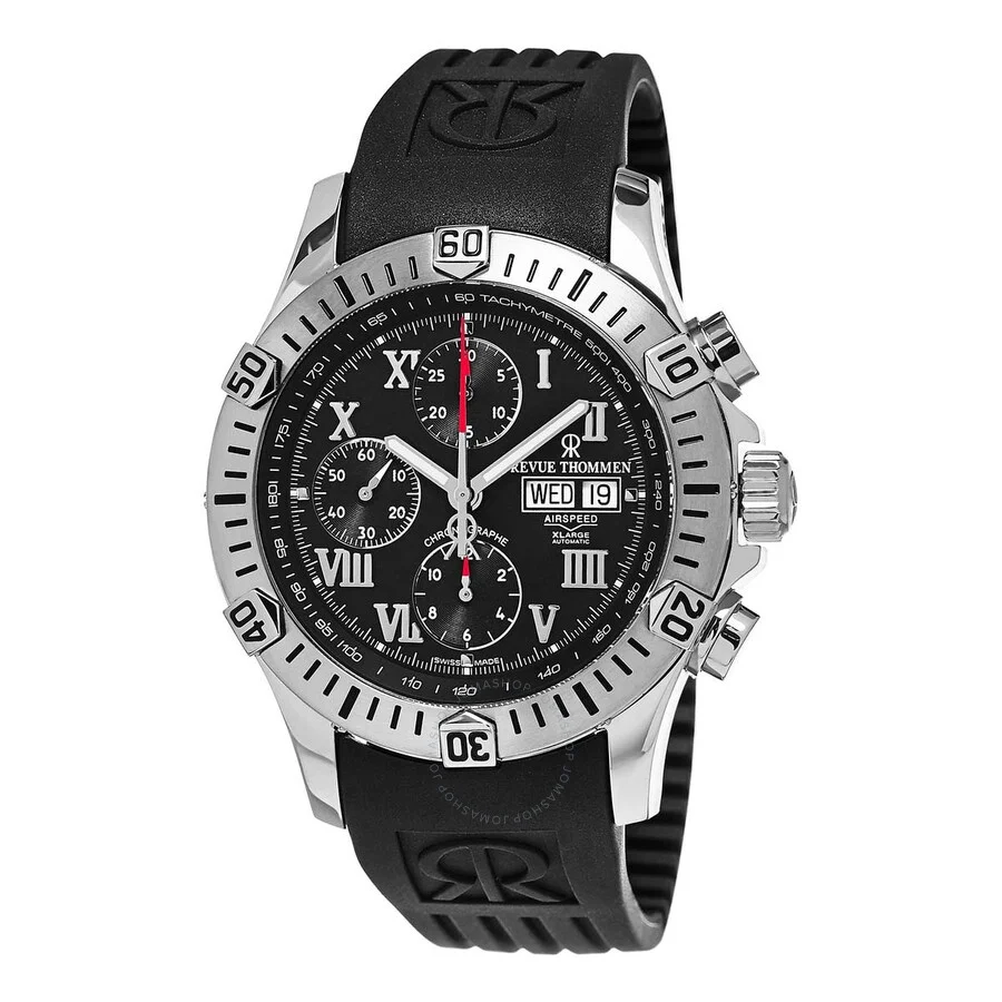 Stainless steel case with a black rubber strap. Uni-directional rotating stainless steel bezel. Black dial with luminous silver-tone hands and Roman numeral hour markers. Minute markers. Tachymeter markings around the outer rim. Dial Type: Analog. Luminescent hands and markers. Day of the week and date display at the 3 o'clock position. Chronograph - three sub-dials displaying: 60 second, 30 minute and 12 hour. Automatic movement with a 38-hour power reserve. Scratch resistant sapphire crystal. Screw down crown. Solid case back. Round case shape. Case size: 45 mm. Case thickness: 16 mm. Band width: 21.5 mm. Band length: 8 inches. Deployment with push button release clasp. Water resistant at 100 meters / 330 feet. Functions: chronograph, tachymeter, date, day of the week, hour, minute, second. Air Speed Series. Casual watch style. Watch label: Swiss Made. Revue Thommen Air speed Chronograph Automatic Black Dial Men's Watch 16071.6837. INFORMATION Brand: Revue Thommen Series: Air Speed Collection Name: Air speed Gender: Mens Model: 16071.6837 Watch Label: Swiss Made Movement: Automatic Power Reserve: 38 hours CASE Case Size: 45 mm Case Thickness: 16 mm Case Material: Stainless Steel Case Shape: Round Case Back: Solid BAND Band Material: Rubber Band Type: Strap Band Color: Black Band Length: 8 inches Band Width: 21.5 mm Clasp: Deployment with Push Button Release DIAL Dial Color: Black Type: Analog Crystal: Scratch Resistant Sapphire Hands: Luminous Silver-tone Dial Markers: Roman Numeral Second Markers: Minute Markers. Tachymeter Markings around the outer rim Sub Dials: Three - 60 Second, 30 Minute and 12 Hour Luminiscence: Hands and Markers Bezel: Uni-directional Rotating Bezel Color: Silver-tone Bezel Material: Stainless Steel Crown: Screw Down FEATURES Water Resistance: 100 meters / 330 feet Calendar: Day of the Week and Date display at the 3 o'clock position Functions: Chronograph, Tachymeter, Date, Day of the Week, Hour, Minute, Second Watch Features: Chronograph, Stainless Steel, Rubber, Analog ADDITIONAL INFO Watch Style: Casual Warranty: 2 Year Jomashop Warranty Jomashop Sku: RVT-16071-6837 Department: Watches Category: Watches