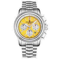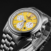 Silver-tone stainless steel case and bracelet. Fixed silver-tone stainless steel bezel. Yellow dial with silver-tone hands and index hour markers. Minute markers around the outer rim. Dial Type: Analog. Luminescent hands and markers. Date display between 4 and 5 o'clock position. Automatic movement. Scratch resistant sapphire crystal. Screw down crown. Transparent case back. Round case shape, case size: 44 mm, case thickness: 16 mm. Band width: 22 mm. Fold over clasp. Water resistant at 100 meters / 330 feet. Functions: chronograph, date, hour, minute, second. Air Speed Series. Luxury watch style. Watch label: Swiss Made. Revue Thommen Air Speed Chronograph Automatic Men's Watch 16041.6438. GENERAL Box Type: Original Box CASE Case Thickness: 16 mm Case Material: Stainless Steel Case Shape: Round Case Back: Transparent BAND Band Material: Stainless Steel Band Type: Bracelet Band Color: Silver-tone Band Width: 22 mm Clasp: Fold Over DIAL Dial Color: Yellow Type: Analog Crystal: Scratch Resistant Sapphire Hands: Silver-tone Dial Markers: Index Second Markers: Minute Markers around the outer rim Luminiscence: Hands and Markers Bezel: Fixed Bezel Color: Silver-tone Bezel Material: Stainless Steel Crown: Screw Down INFORMATION Brand: Revue Thommen Series: Air Speed Collection Name: Air Speed Gender: Mens Model: 16041.6438 Watch Label: Swiss Made Movement: Automatic FEATURES Water Resistance: 100 meters / 330 feet Calendar: Date display between 4 and 5 o'clock position Functions: Chronograph, Date, Hour, Minute, Second Watch Features: Analog, Stainless Steel, Chronograph ADDITIONAL INFO Watch Style: Luxury Warranty: 2 Year Jomashop Warranty Jomashop Sku: Y-A57KH Department: Watches
